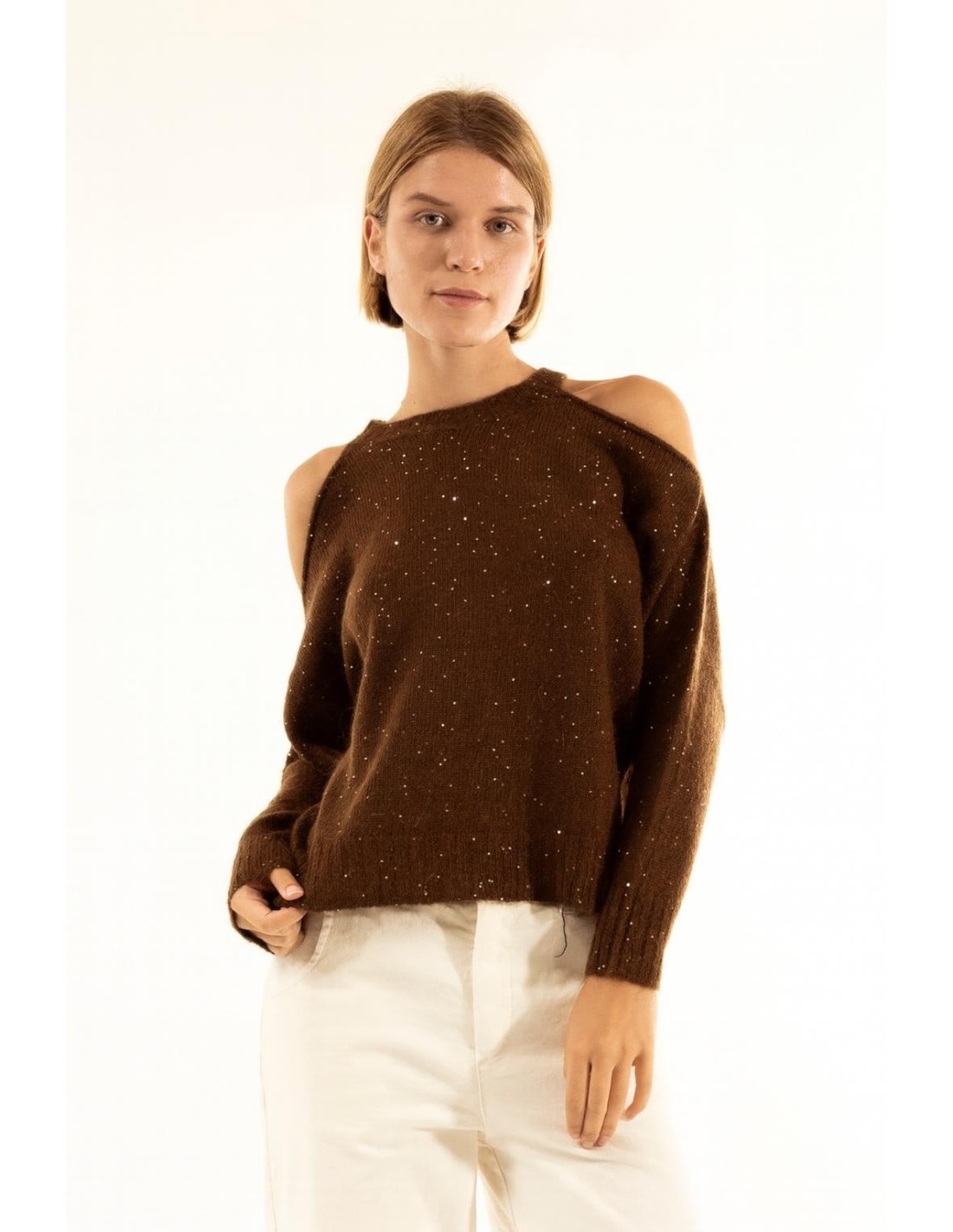 Camisola Kontatto de corte macio e feminino. Fio suave com micro lantejoulas que iluminam sem renunciar ao conforto. Ombros descobertos e bordos canelados definem a silhueta com um toque sensual. Perfeita do dia para a noite: do trabalho com denim ou alfaiataria, até ao aperitivo.