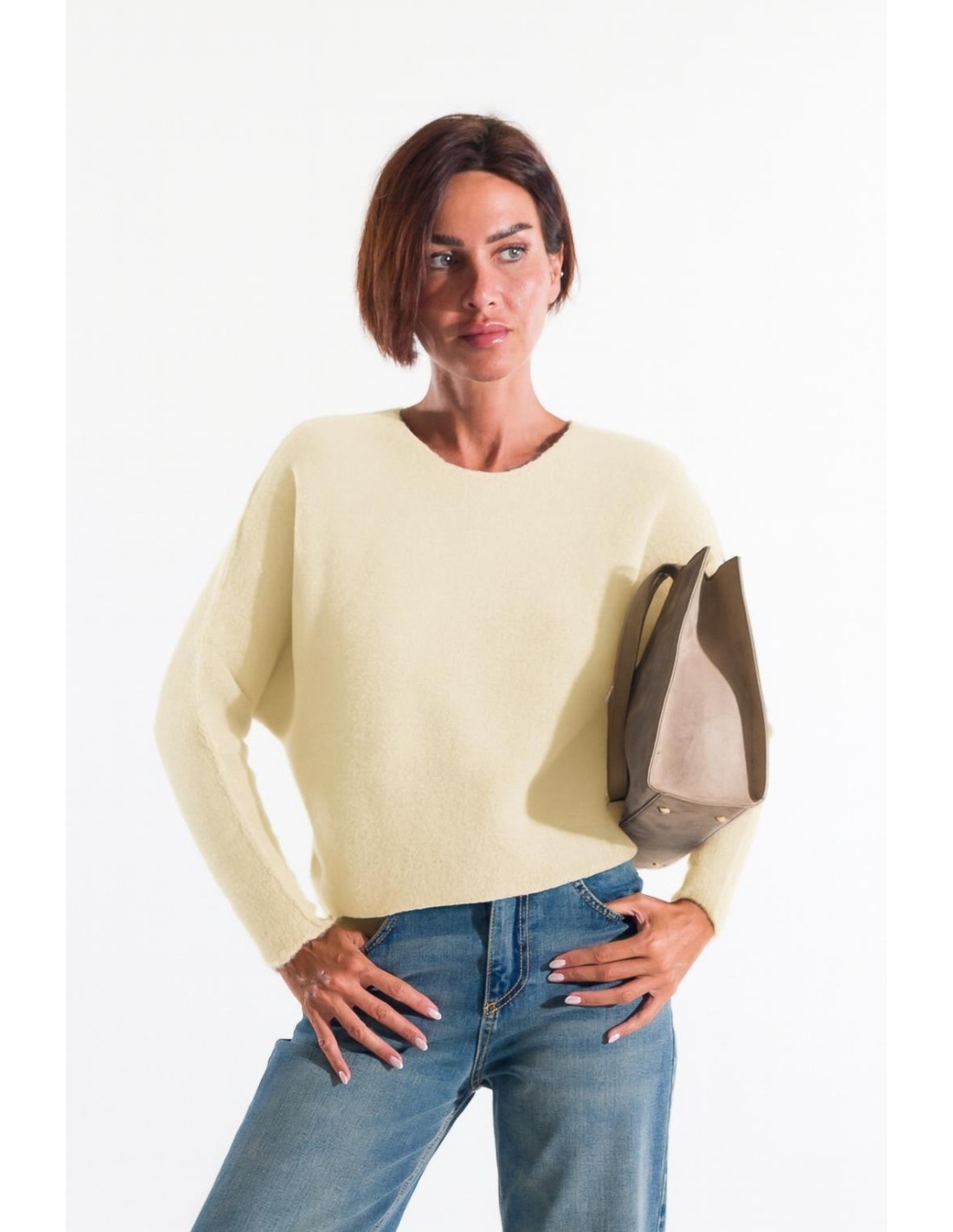 Pullover Kontatto de corte suave e ligeiramente curto, que desenha uma silhueta descontraída. Fio macio e agradavelmente quente, com toque bouclé. Gola redonda limpa e ombros caídos para liberdade de movimento. Perfeito do escritório ao fim de semana: fácil de combinar, confere conforto e feminilidade sem esforço.