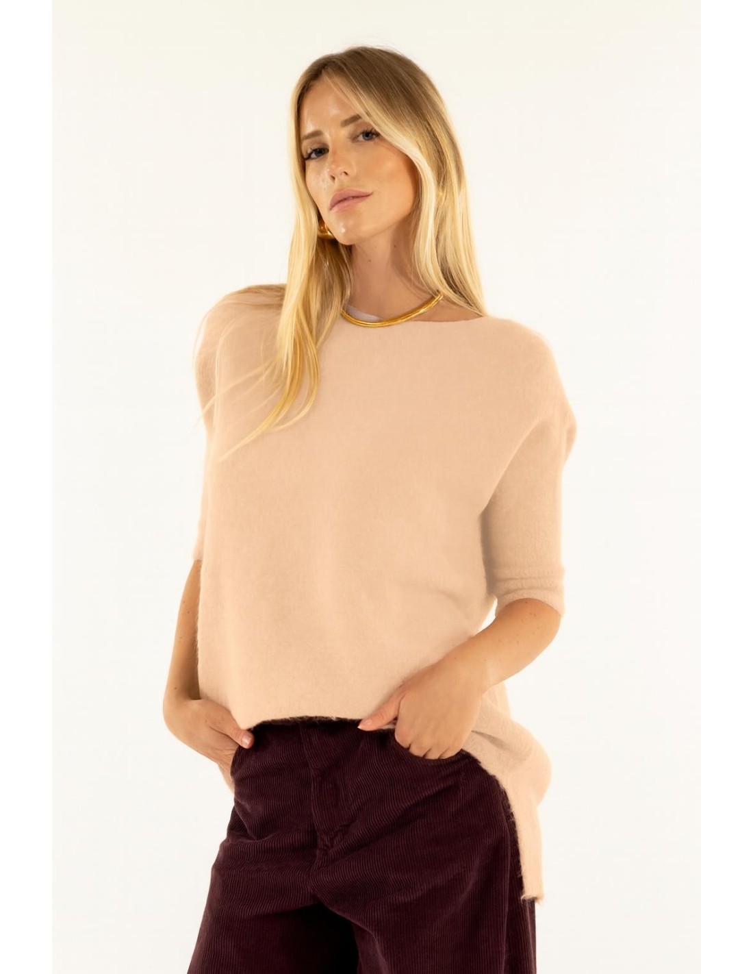 Kontatto assina uma camisola macia de corte descontraído que acaricia a silhueta sem marcar. Fio macio e vaporoso, toque quente. Decote barco que realça o pescoço, mangas até ao cotovelo e fendas laterais para liberdade de movimento. Perfeita para o escritório com calças de alfaiataria ou para um estilo casual chique do dia a dia.