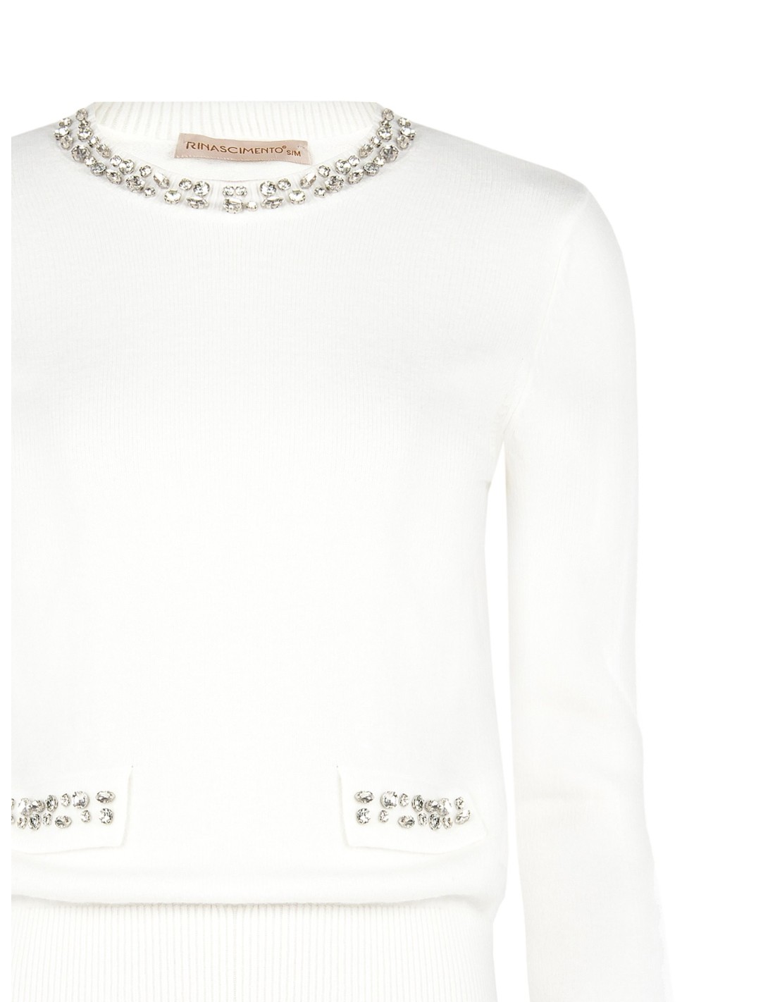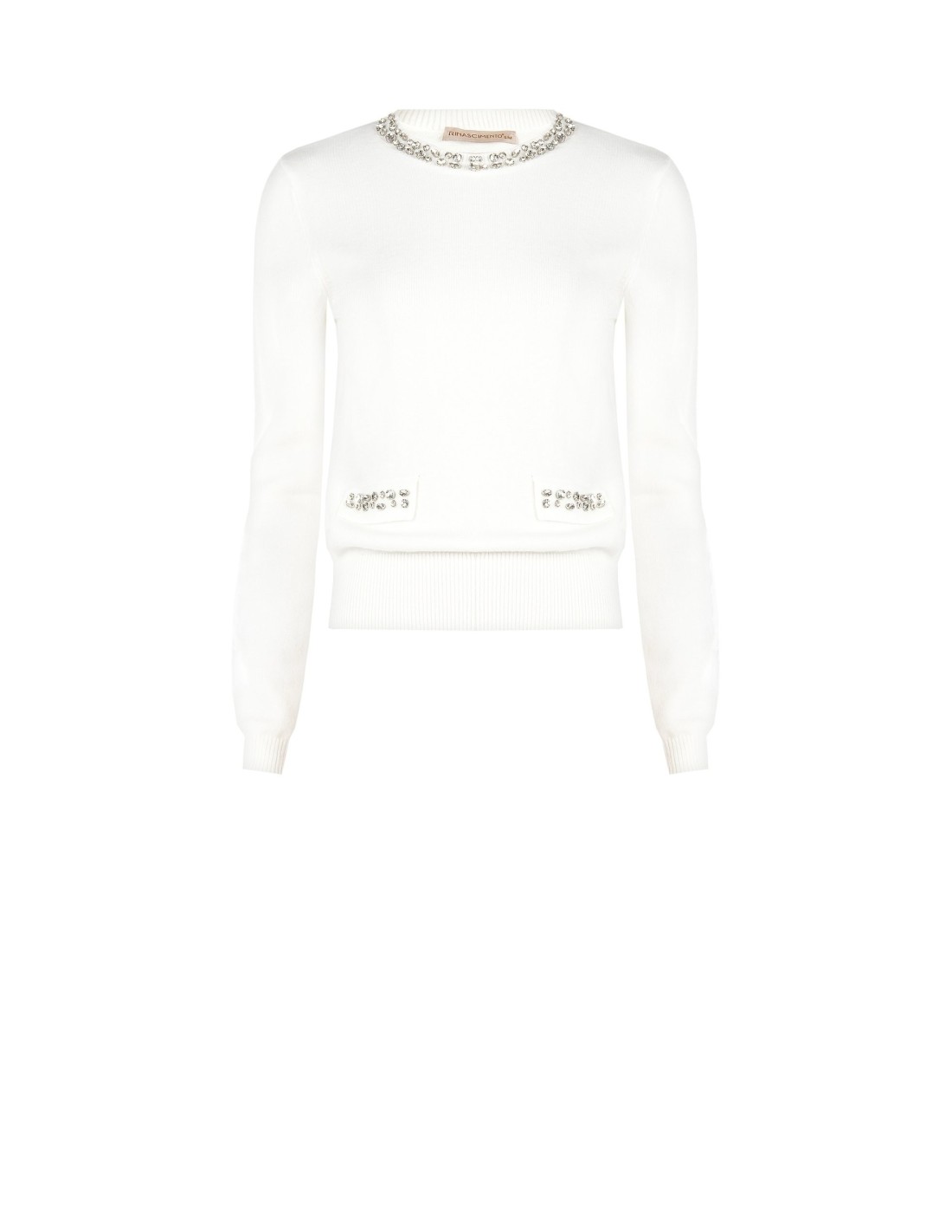 Camisola de corte regular e feminino, em malha fina macia e agradável na pele. Decote redondo enriquecido com cabochões e micro-bolsos frontais com aplicações luminosas. Barra e punhos canelados definem a silhueta sem apertar. Perfeita do escritório ao aperitivo, fácil de combinar com saias ou denim.