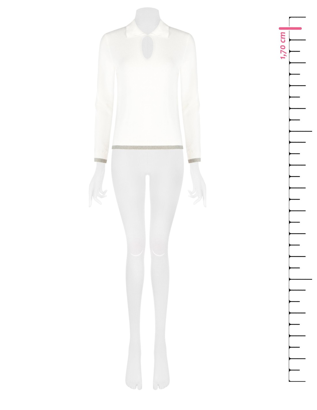 Camisola justa Rinascimento que esculpe a silhueta com conforto. Tricot fino, macio e ligeiramente elástico, com acabamento em micro lurex. Gola limpa e recorte sensual em forma de gota que ilumina o decote. Perfeito do escritório para o aperitivo, fácil de combinar com calças ou saias à medida.