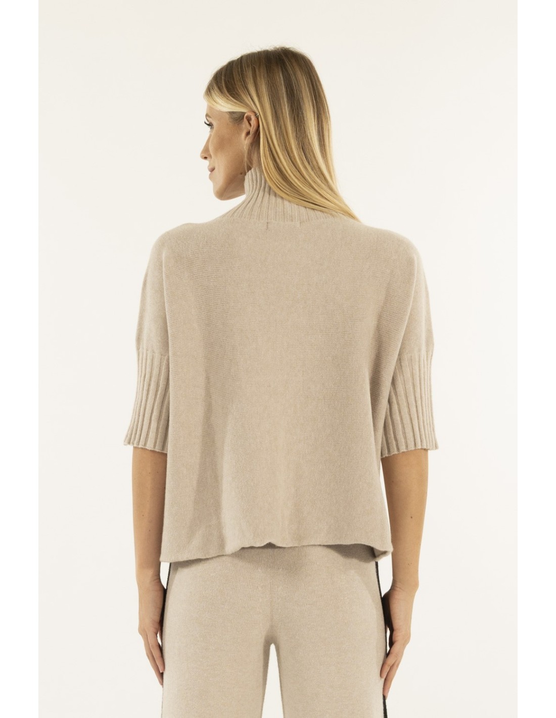 Kontatto interpreta o camisola relaxed com silhueta ampla e suave. Fio macio e leve, agradável na pele. Gola alta em canelado e mangas 3/4 com trabalhado em canelado para volume controlado. Versátil do escritório ao fim de semana: fácil de combinar, oferece conforto e harmoniza a figura.