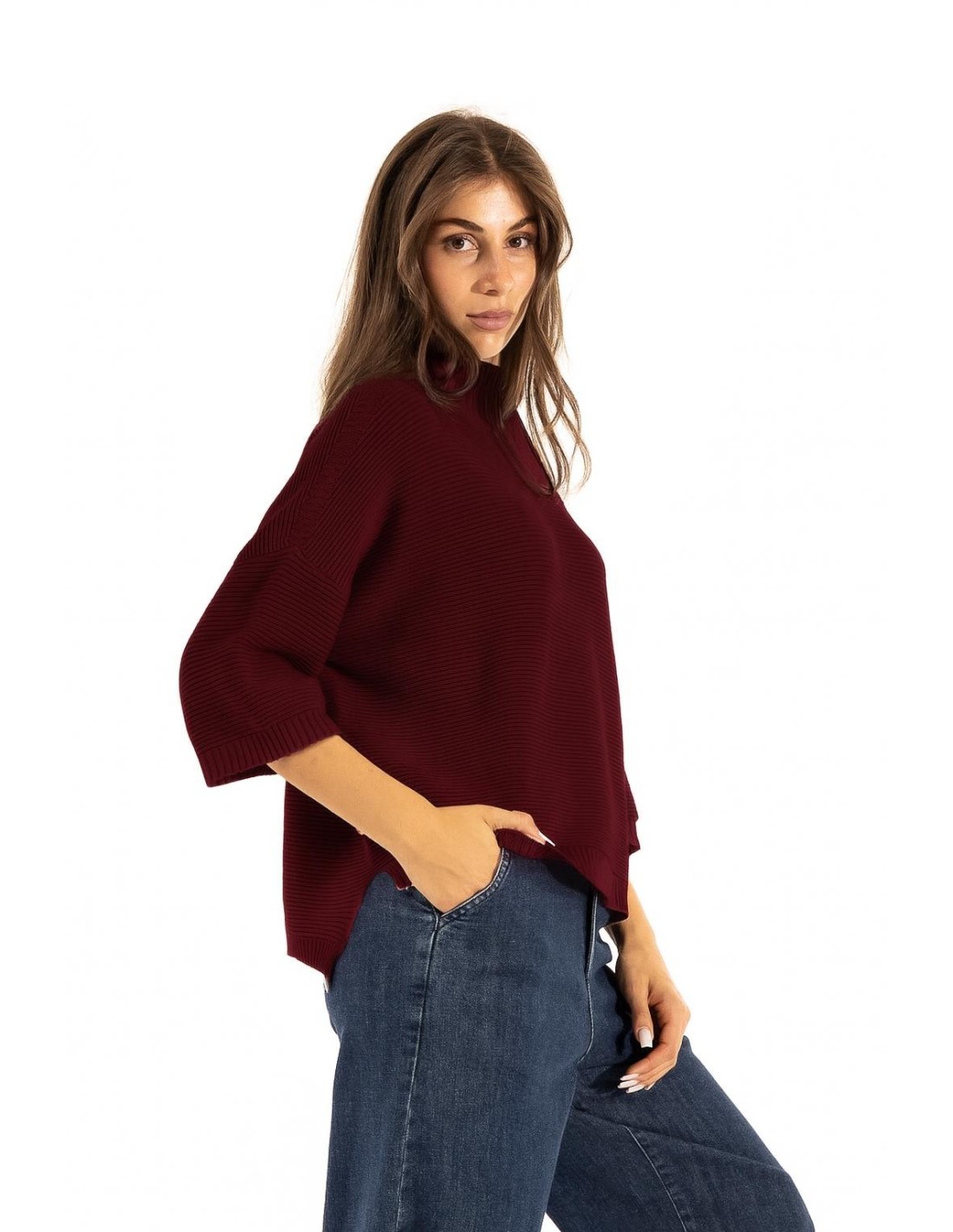 Camisola Kontatto com corte solto e ligeiramente oversized: envolve sem marcar, valorizando a silhueta. Malha canelada compacta, agradável na pele. Gola alta macia e mangas largas ao nível do cotovelo, barra com pequenas fendas para liberdade de movimento. Perfeita para o escritório ou para um look daily chic com denim e alfaiataria.