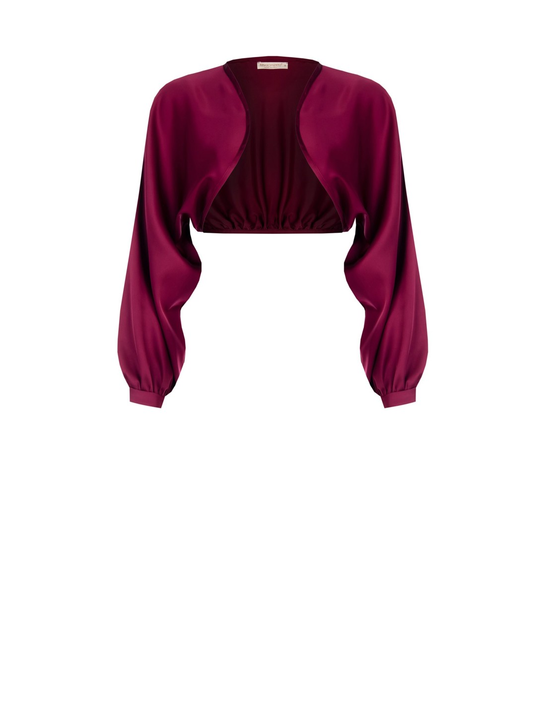 Bolero curto com ajuste justo abaixo do peito e mangas amplas que alongam a silhueta. Confeccionado em cetim fluido e luminoso para um toque sedoso na pele. Abertura frontal sem fechos e punhos estruturados: veste-se e está pronto. Perfeito sobre vestidos e tops para cerimónias, festas e jantares elegantes.