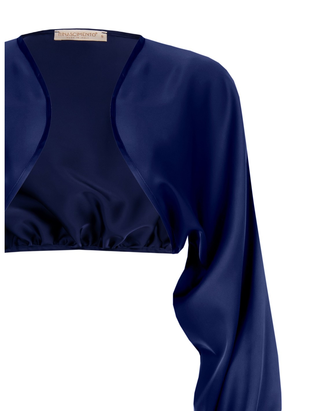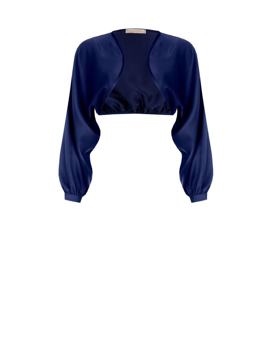Bolero curto com ajuste justo abaixo do peito e mangas amplas que alongam a silhueta. Confeccionado em cetim fluido e luminoso para um toque sedoso na pele. Abertura frontal sem fechos e punhos estruturados: veste-se e está pronto. Perfeito sobre vestidos e tops para cerimónias, festas e jantares elegantes.