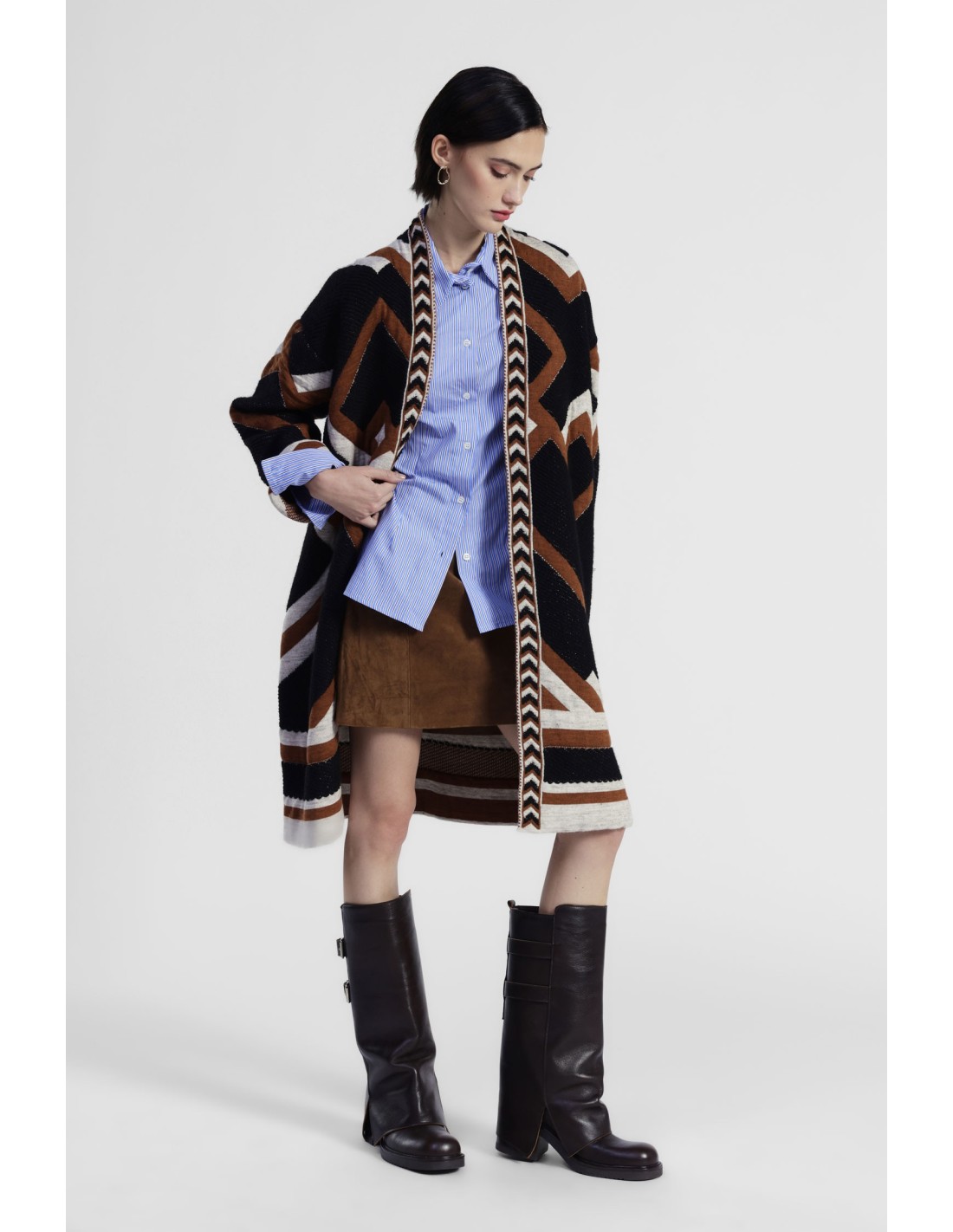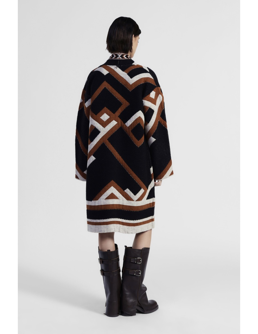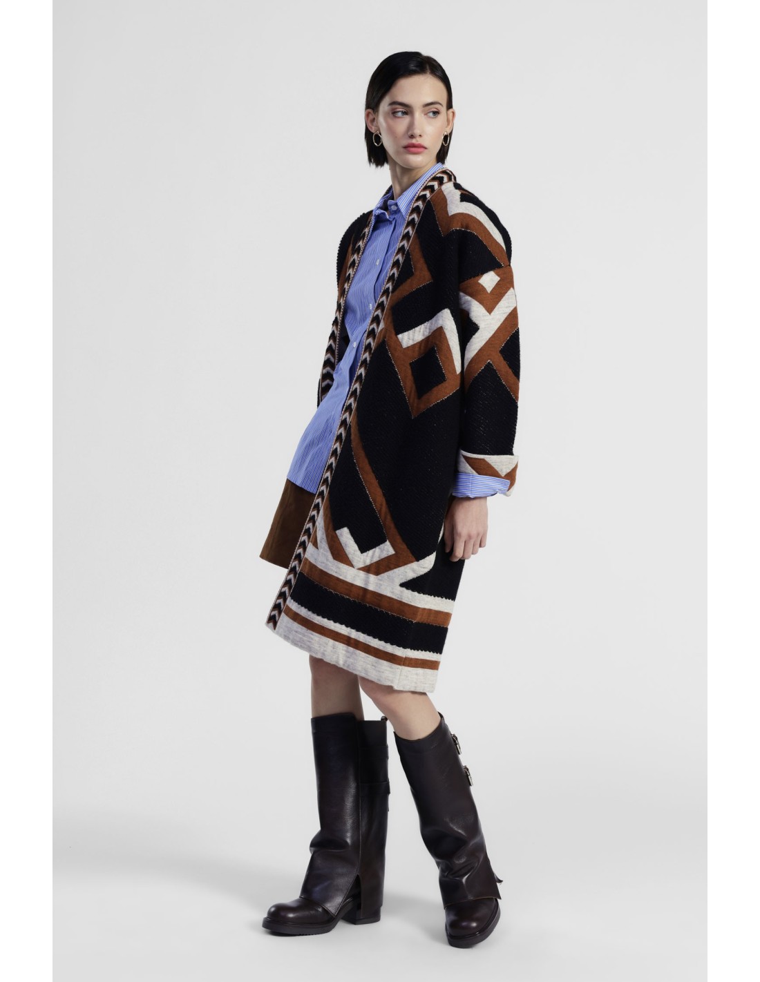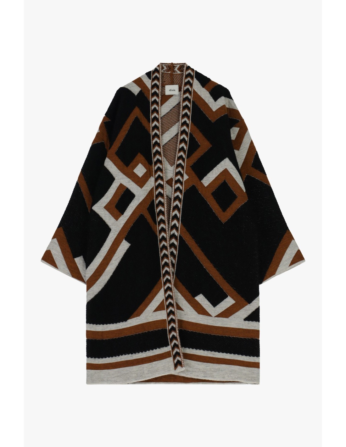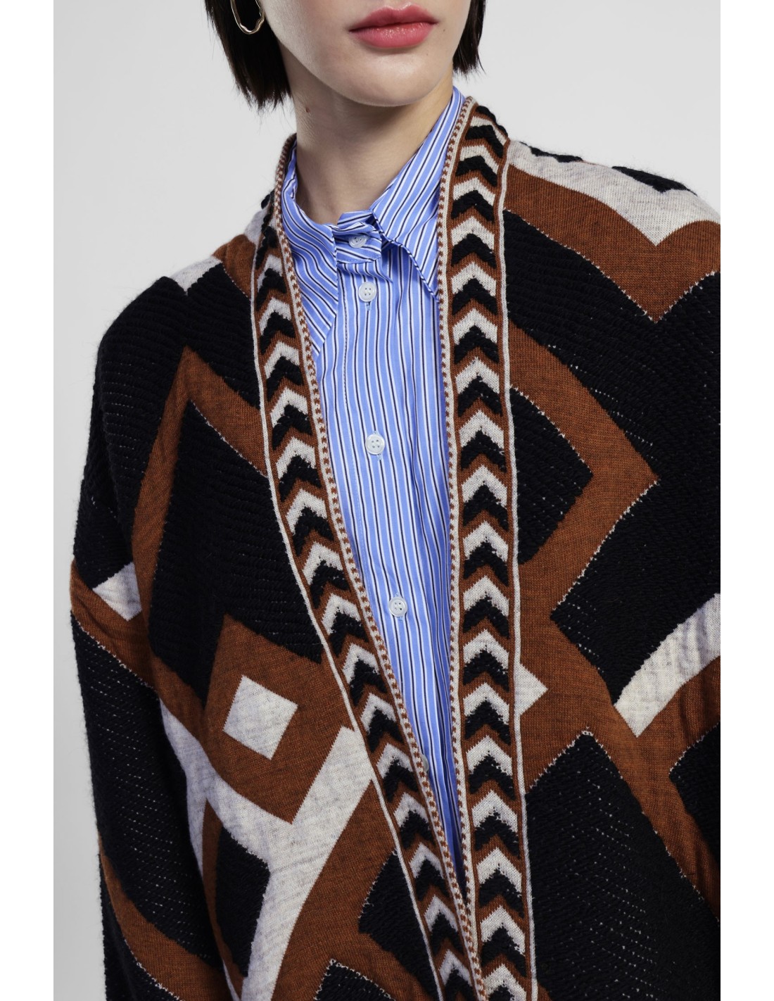 Esta capa envolvente destaca-se pelo seu padrão geométrico marcante e pela borda decorativa que lhe confere personalidade. Ideal para usar em momentos de descontração ou para completar um look quotidiano com um toque original e feminino. Corte amplo e mangas suaves para o máximo conforto em qualquer momento.