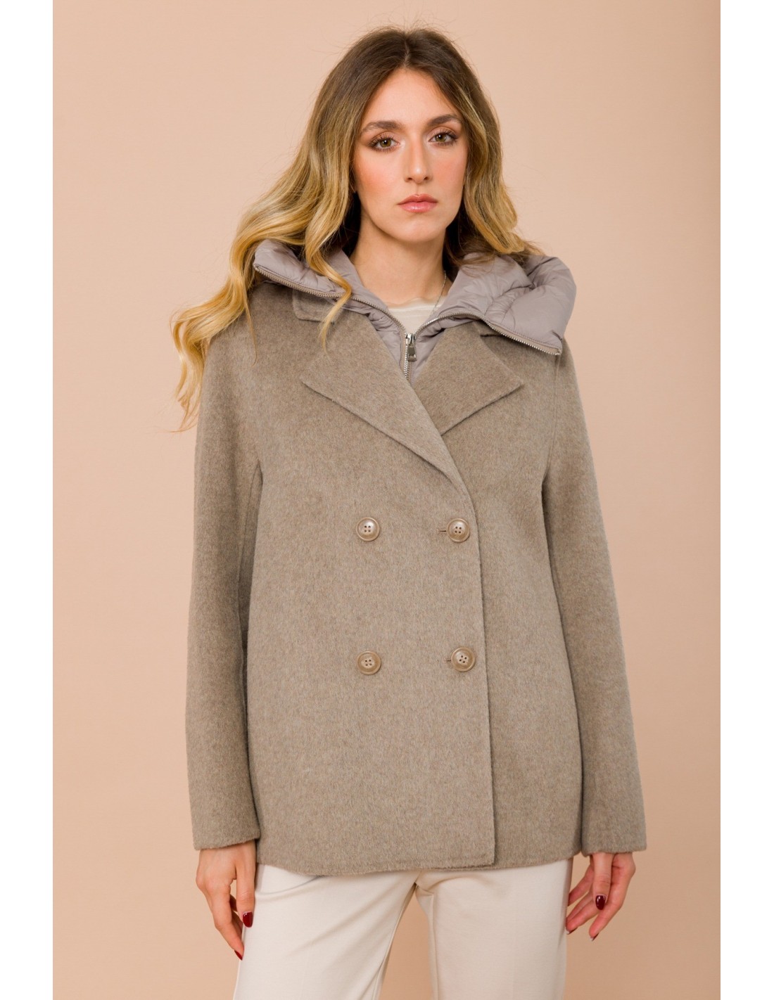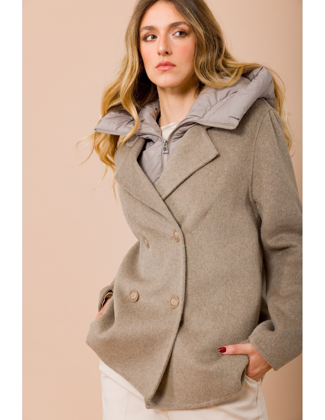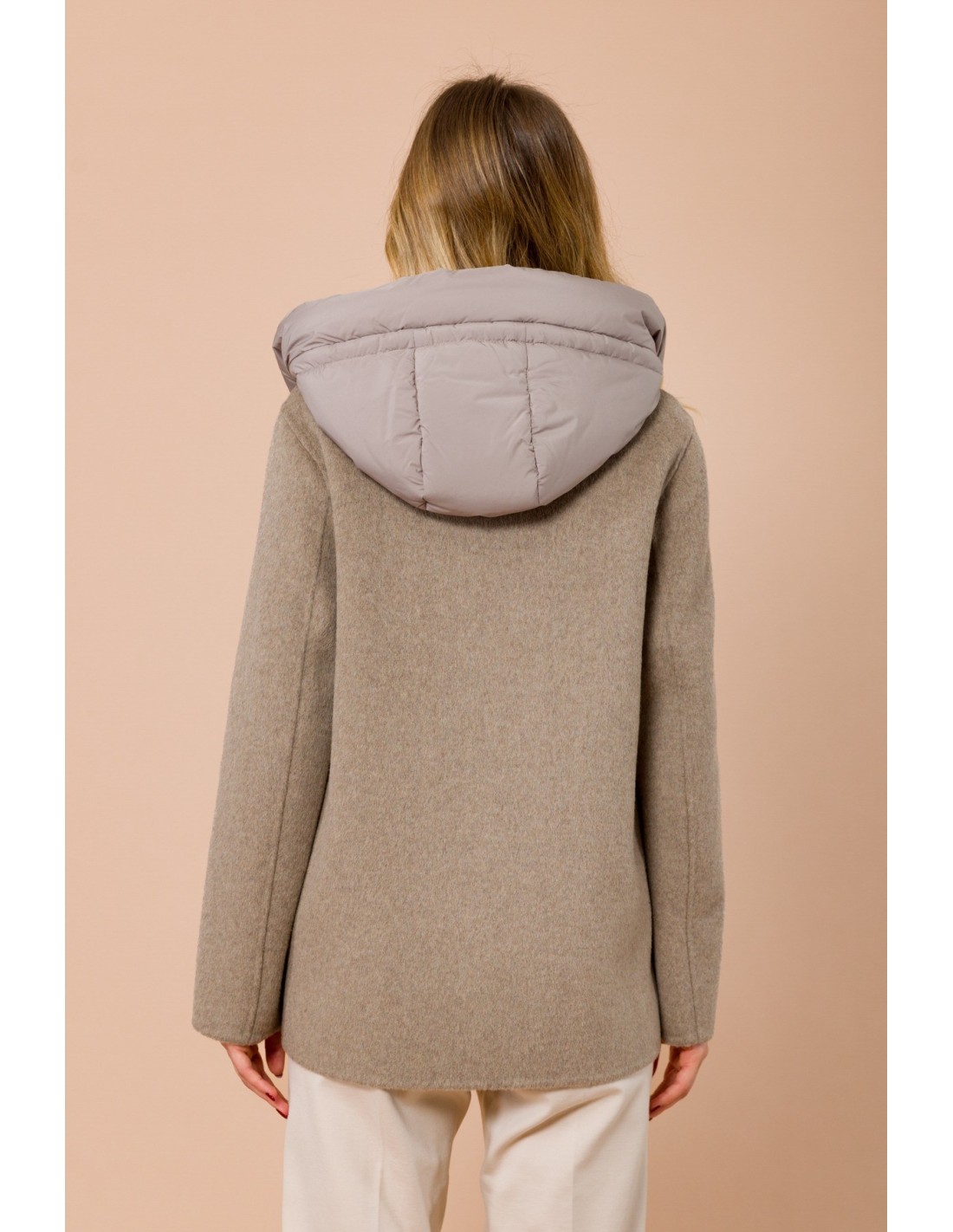 Maryley assina um casaco curto com um corte direito e confortável. Exterior em mistura de lã macia, interior acolchoado em tecido matelassé para um aquecimento leve. Corte duplo com lapelas e colete com capuz removível: dois looks num só. Perfeito para o escritório e o dia a dia, confere estrutura à silhueta sem renunciar à praticidade.