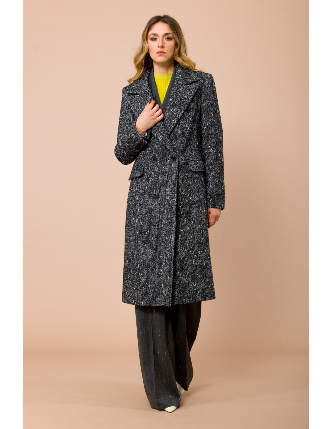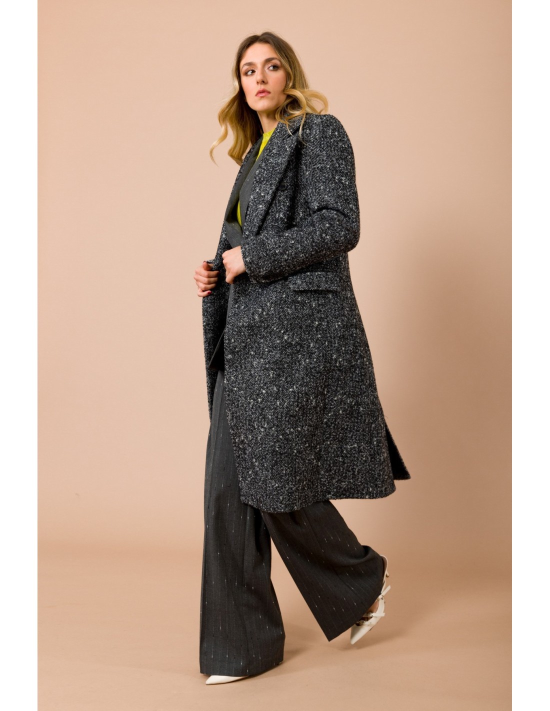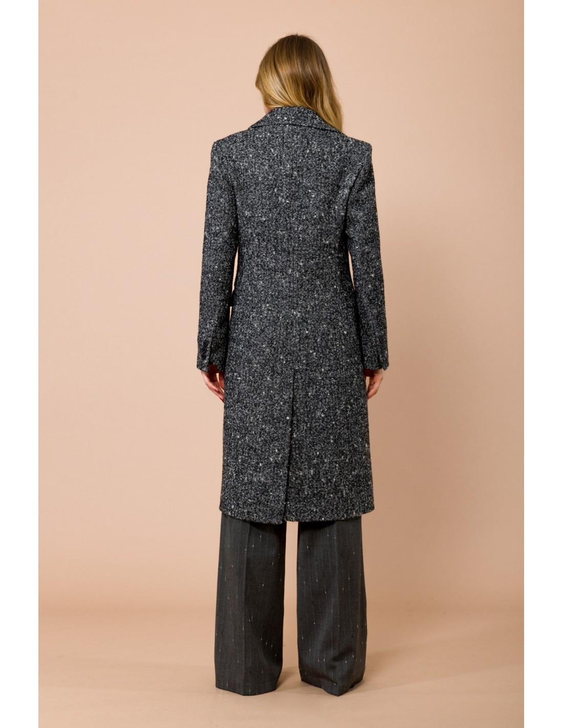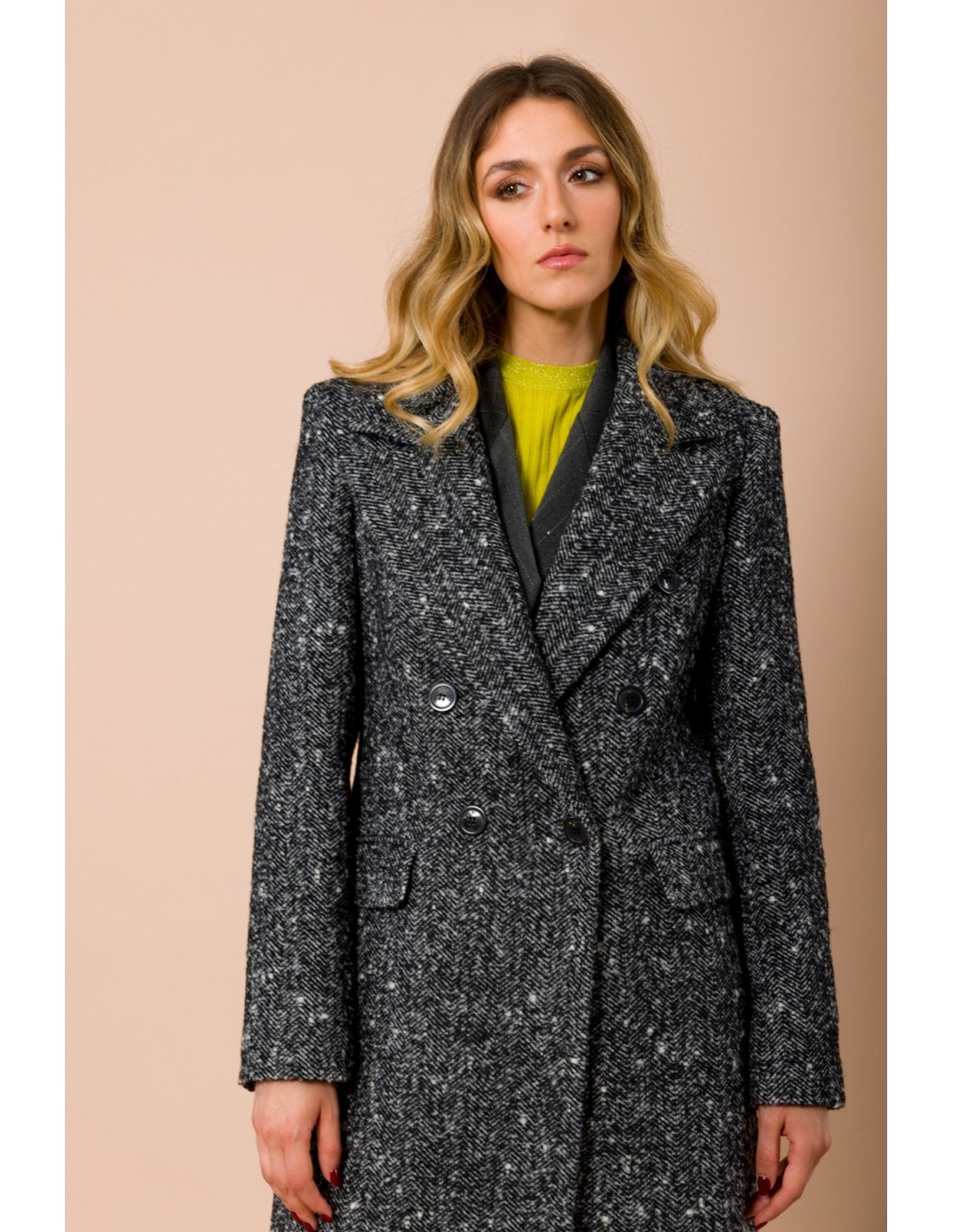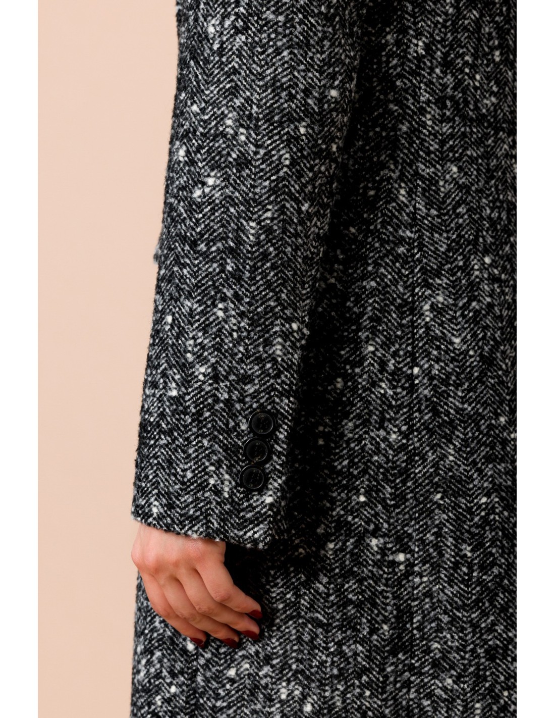 Maryley apresenta um casaco midi de corte justo mas confortável. Confeccionado em tecido bouclé espinha-de-peixe, envolve sem pesar. Lapela ampla, abotoamento duplo e fenda posterior para liberdade de movimento. Perfeito sobre fato no escritório e com denim no quotidiano: valoriza a silhueta com elegância discreta.