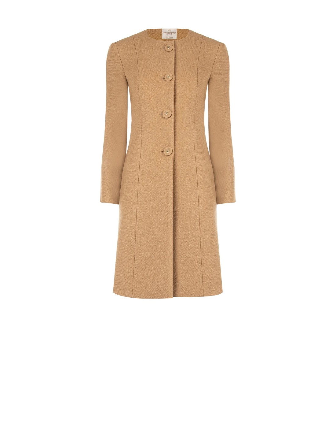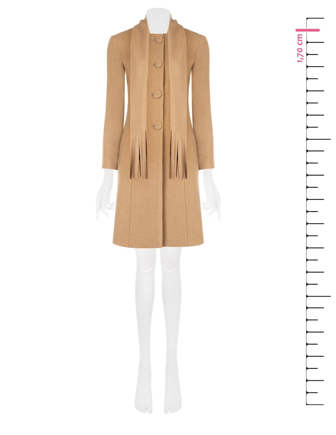Sobretudo longo de corte ligeiramente acinturado que valoriza a silhueta, em tecido macio e compacto com aspeto de feltro. O cachecol integrado com franjas e os grandes botões forrados acrescentam carácter. Perfeito sobre fatos de escritório e looks quotidianos requintados.