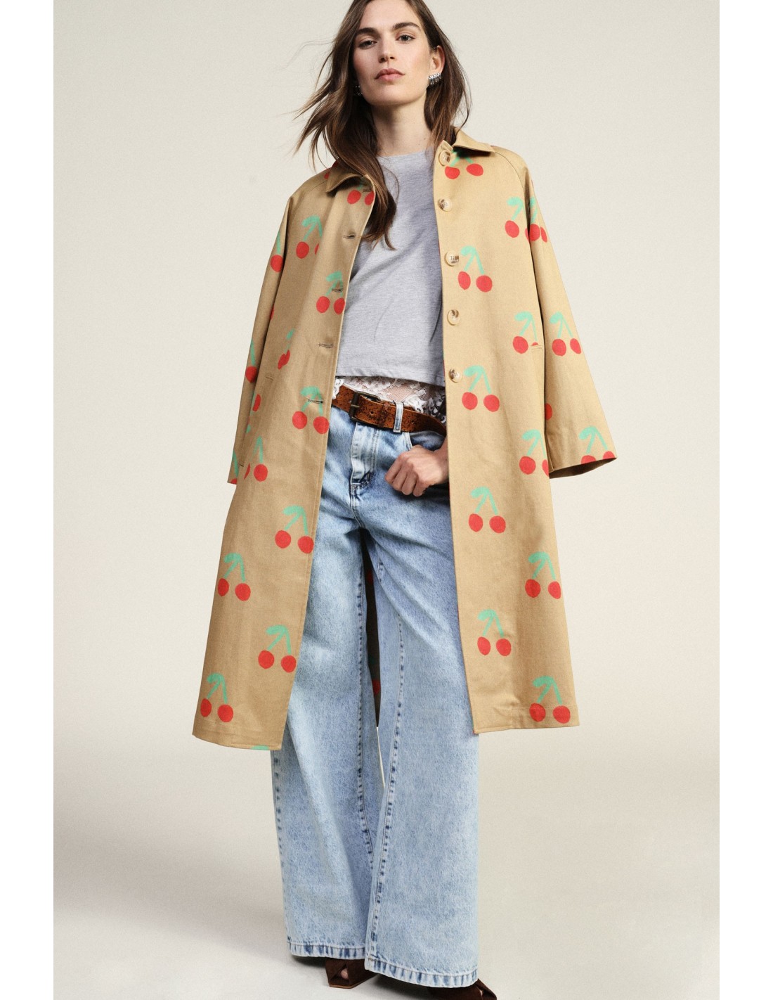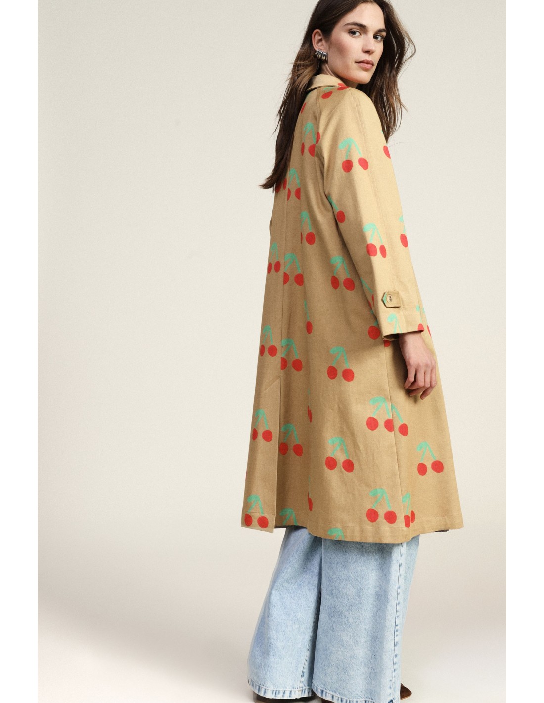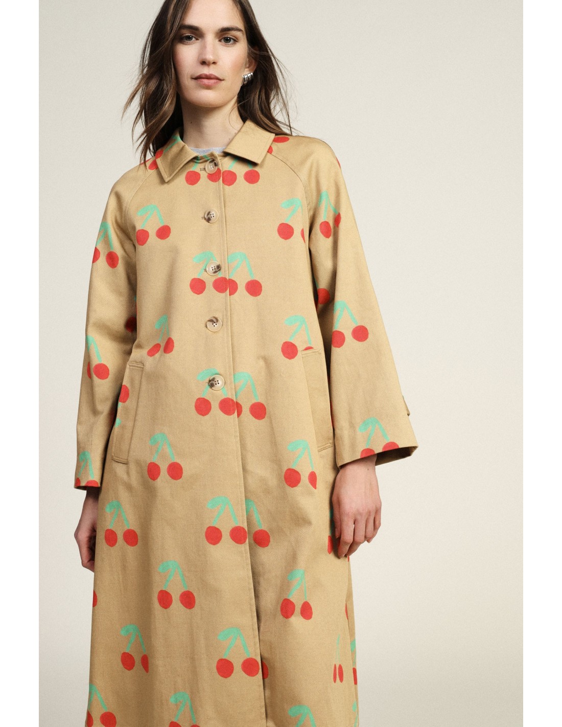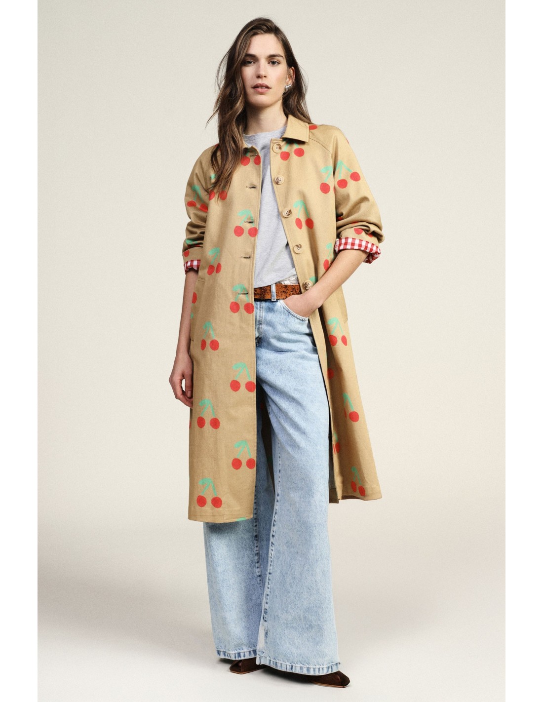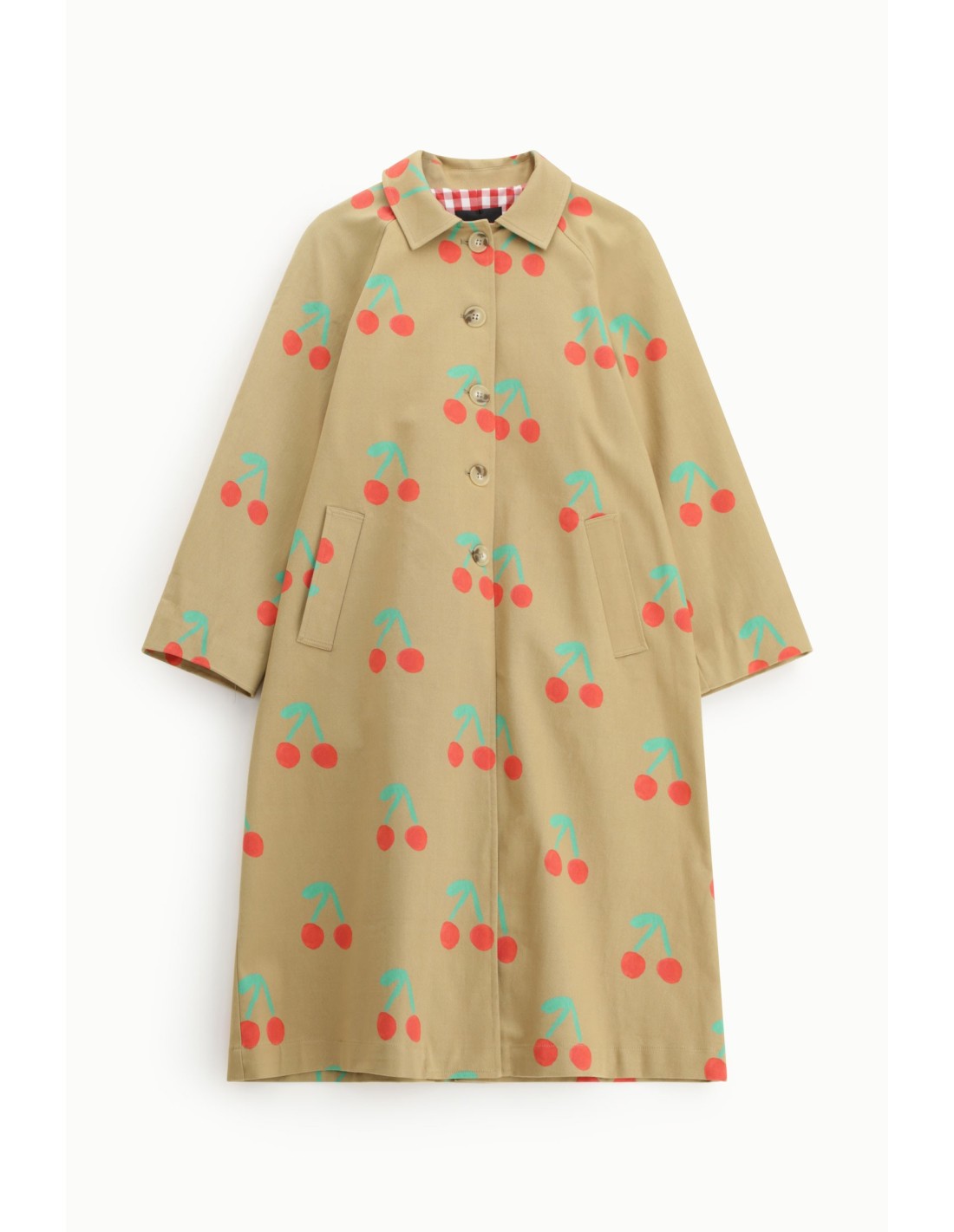 Um casaco comprido com estampa de cerejas que anima qualquer dia ordinário. O fecho frontal com botões, os bolsos laterais e o forro aos quadrados oferecem conforto e detalhes divertidos. Perfeito para acompanhar-te com estilo nos teus compromissos diários, adicionando um toque original e vibrante ao look.