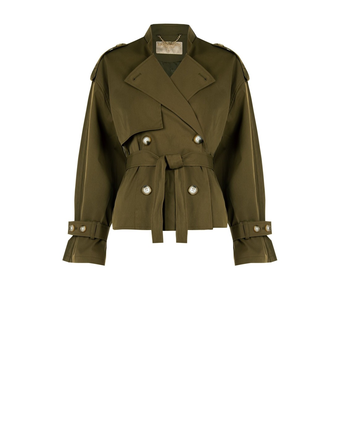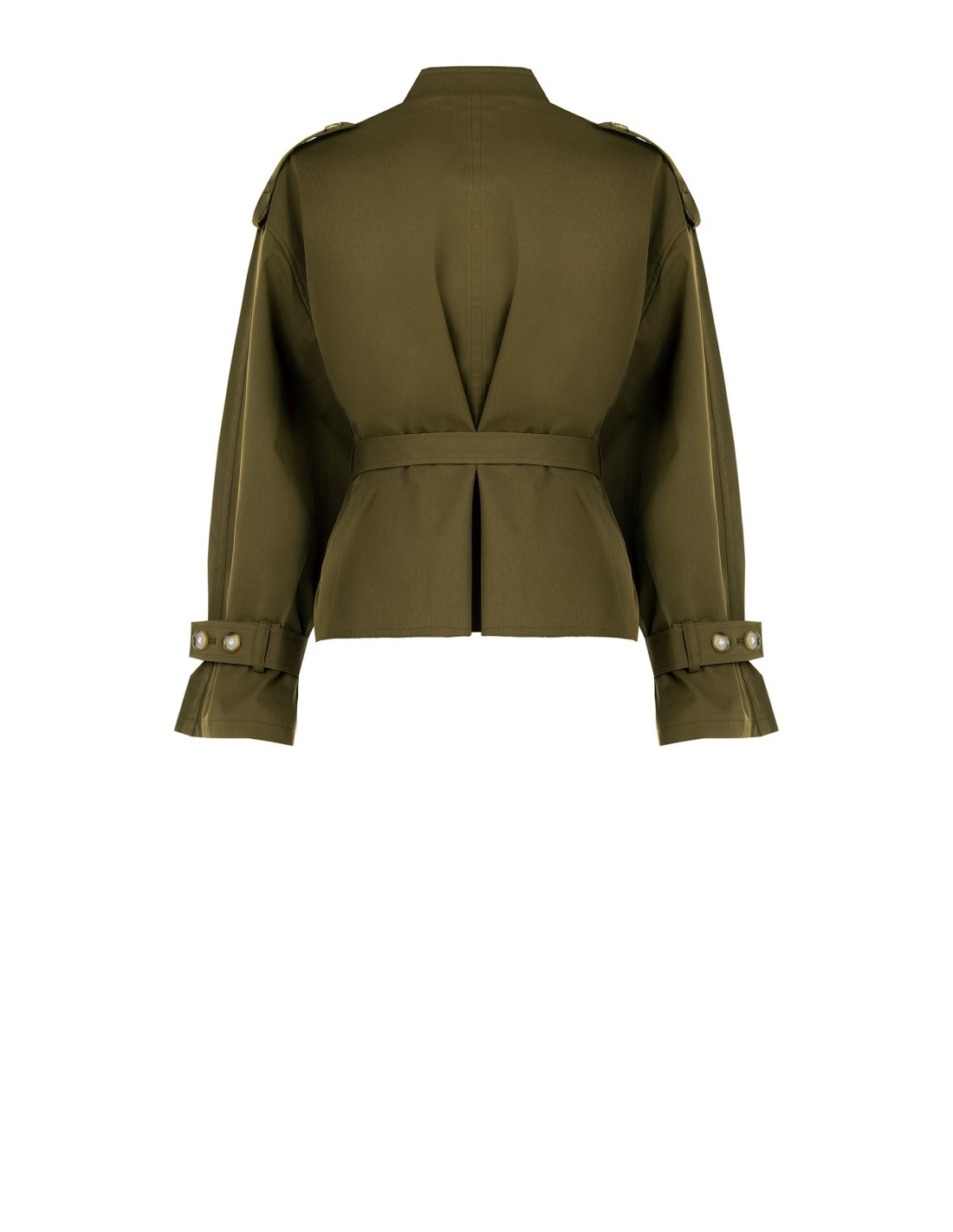 Casaco cruzado curto com corte suave, ajustável na cintura graças ao cinto que valoriza a silhueta. Confeccionado em tecido leve de toque compacto, apresenta ombreiras e punhos com tiras. Perfeito com vestidos e denim para o escritório e para o look urbano diário.