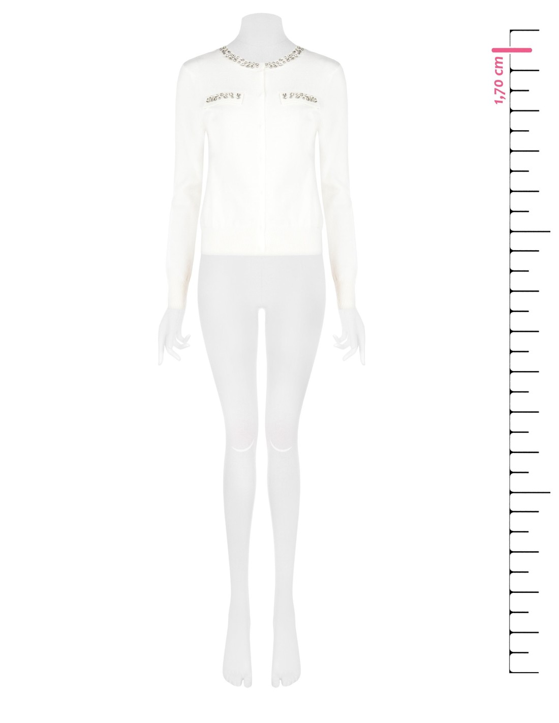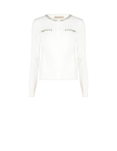 Cardigan feminino com corte regular que valoriza a silhueta sem apertar. Malha macia e sedosa com toque compacto. Gola redonda acabada com aplicações cabochon e abas decorativas valorizadas. Fecho frontal oculto para um look limpo. Perfeito para escritório e aperitivos, também se presta ao chique do dia a dia.