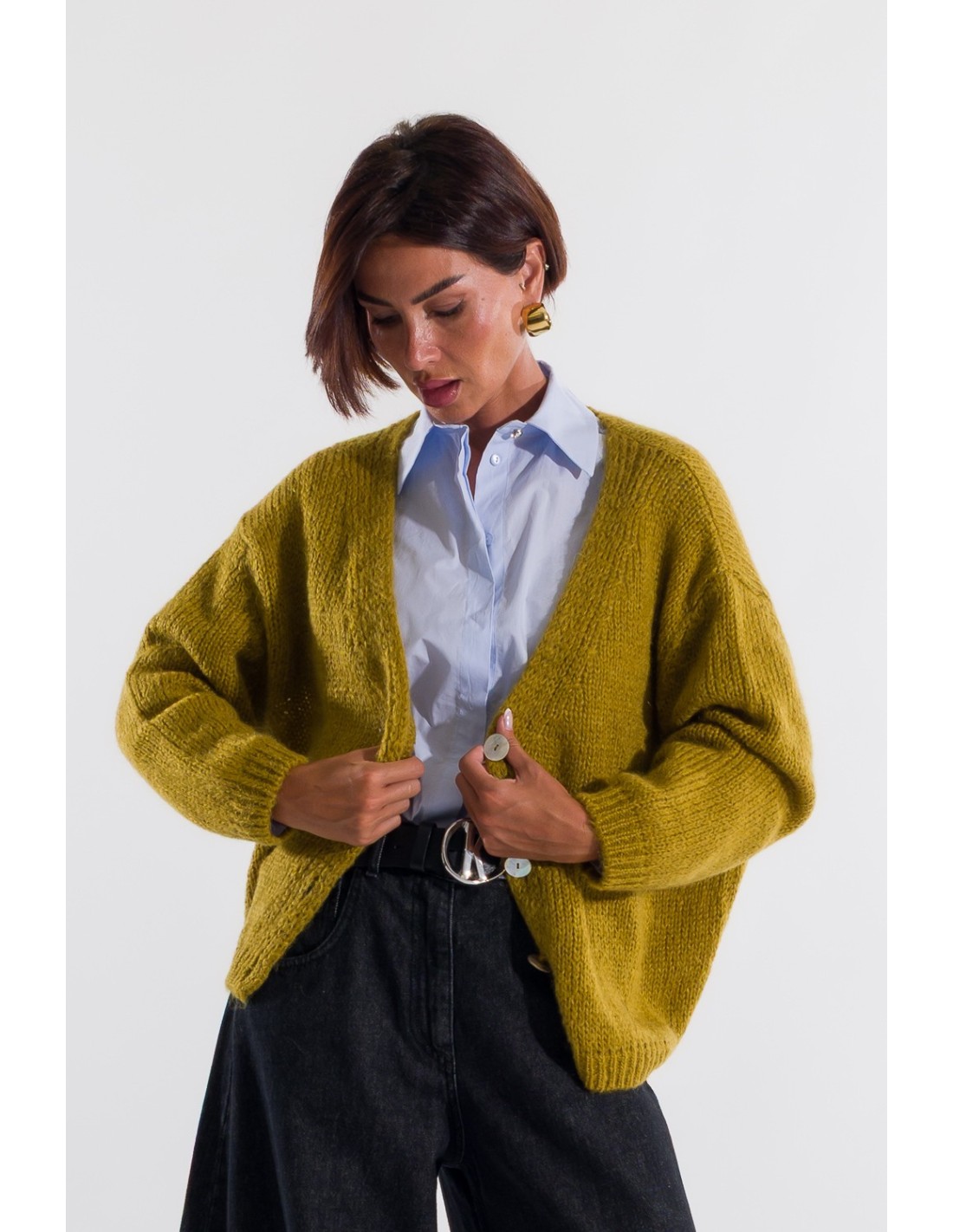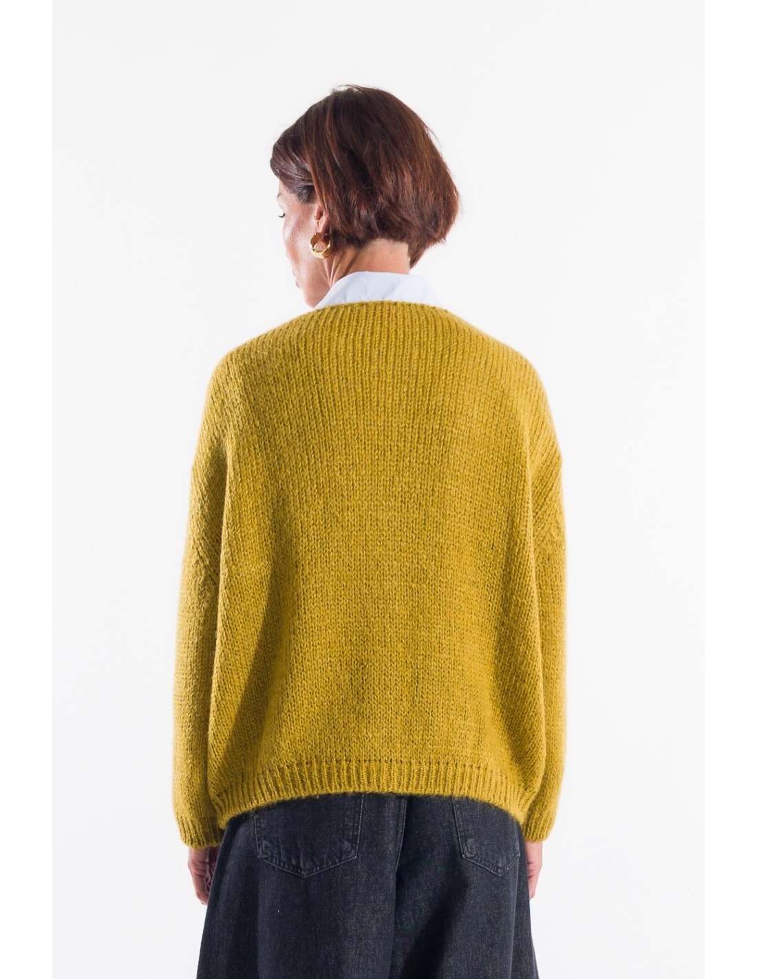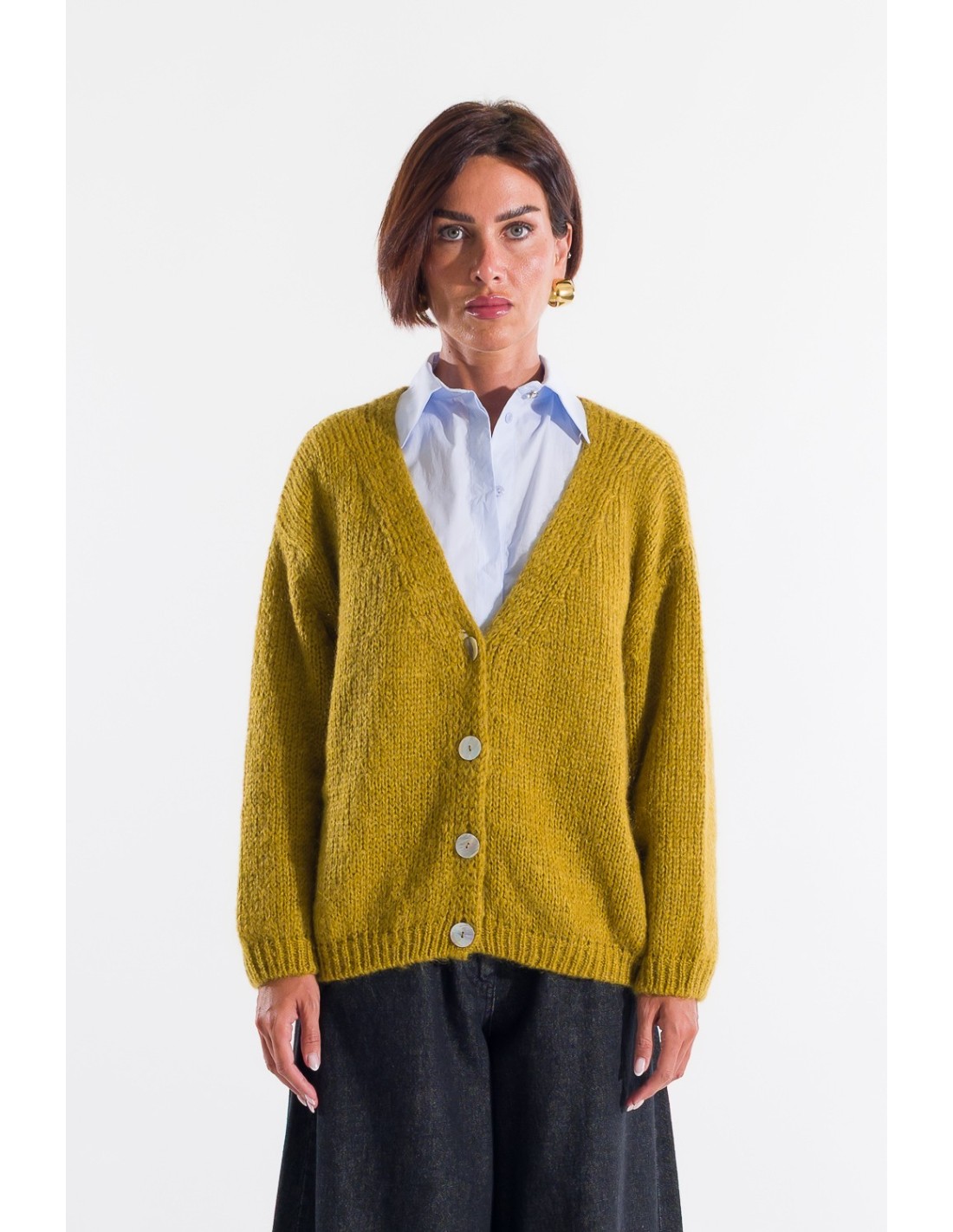 Kontatto interpreta a camisola cozy: linha suave e ligeiramente oversized que valoriza sem marcar. Fio macio com toque felpudo, agradável na pele. Decote em V profundo e botões maxi em madrepérola para um twist moderno. Perfeita sobre camisa no escritório ou com denim para o dia a dia.