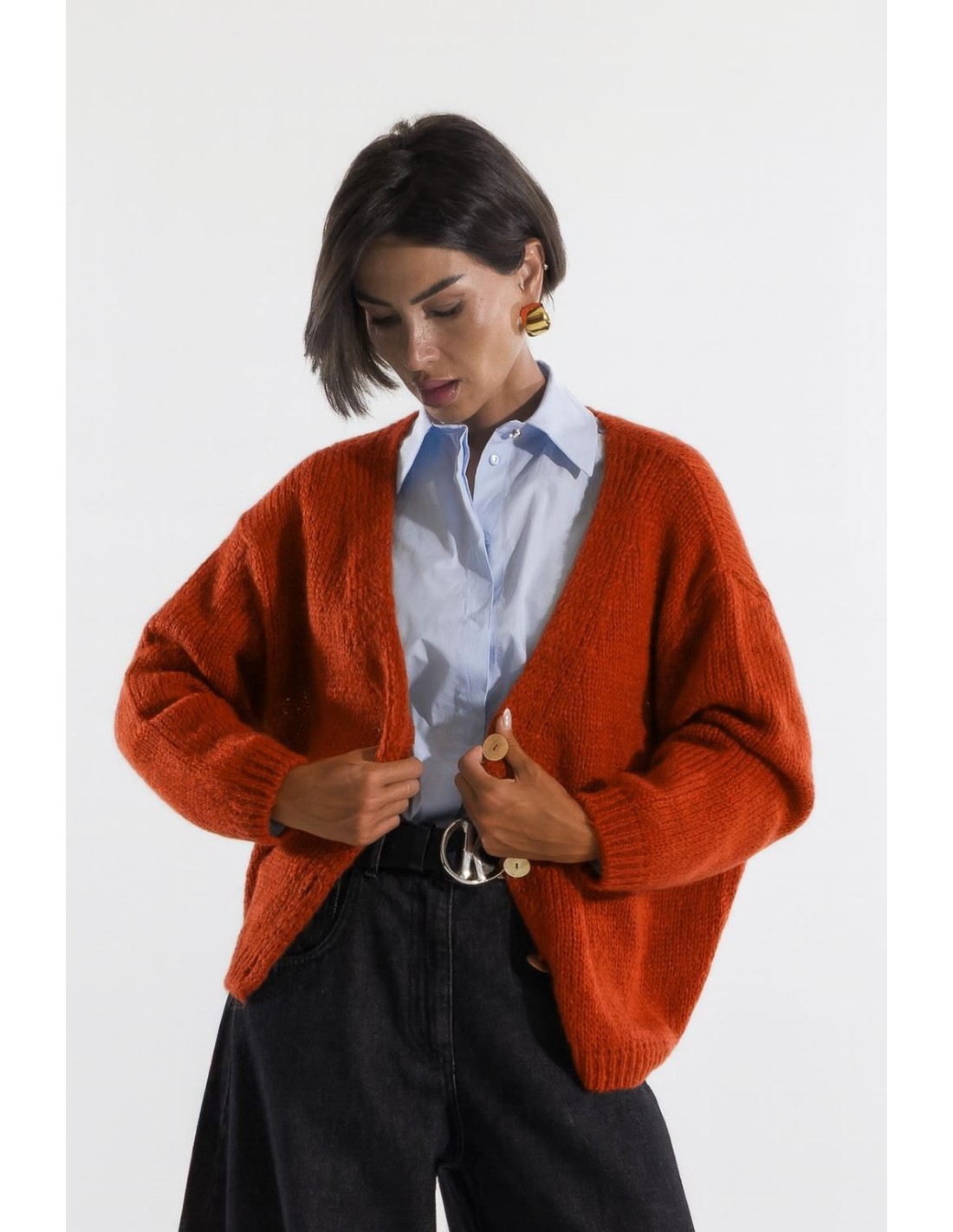 Kontatto interpreta a camisola cozy: linha suave e ligeiramente oversized que valoriza sem marcar. Fio macio com toque felpudo, agradável na pele. Decote em V profundo e botões maxi em madrepérola para um twist moderno. Perfeita sobre camisa no escritório ou com denim para o dia a dia.