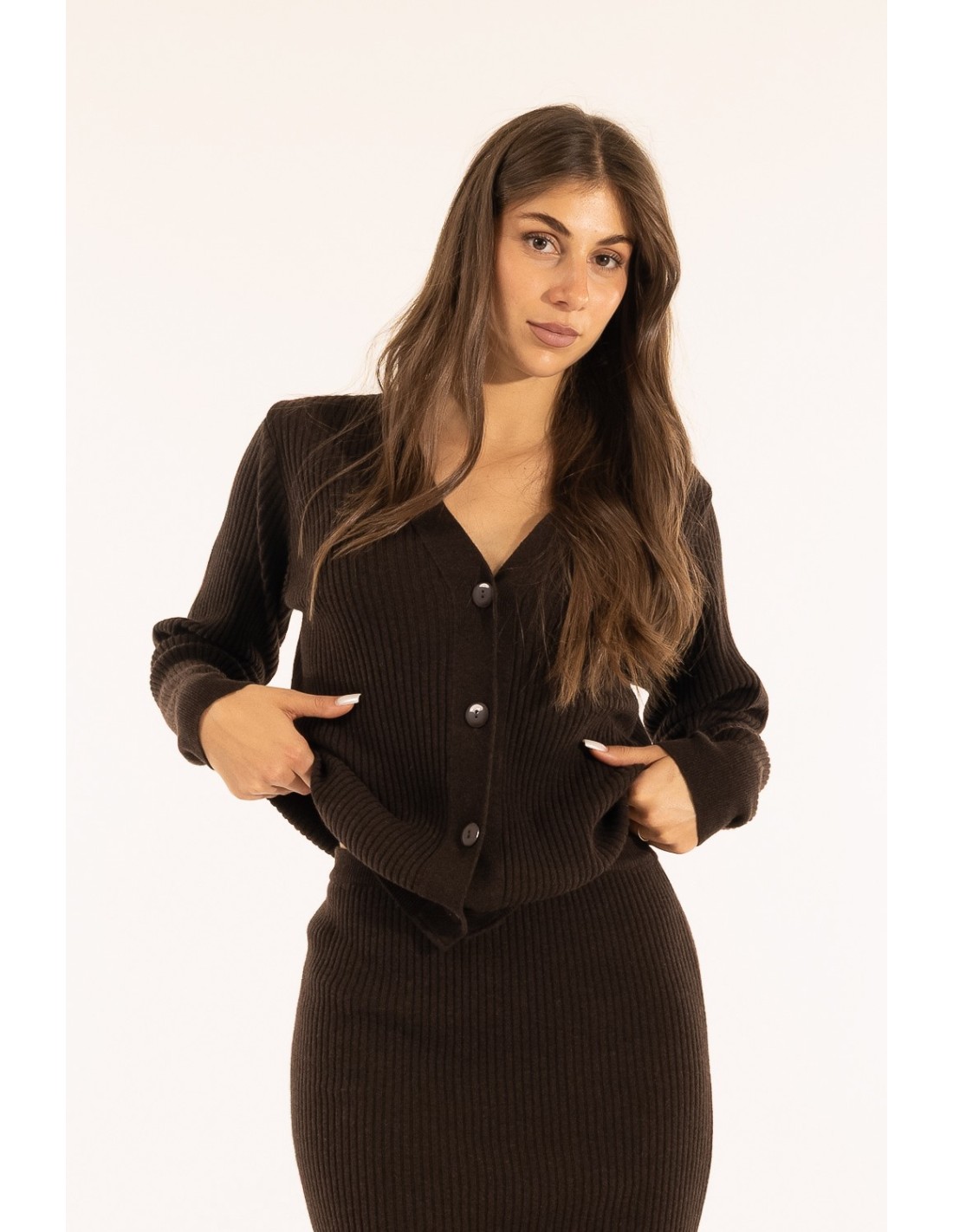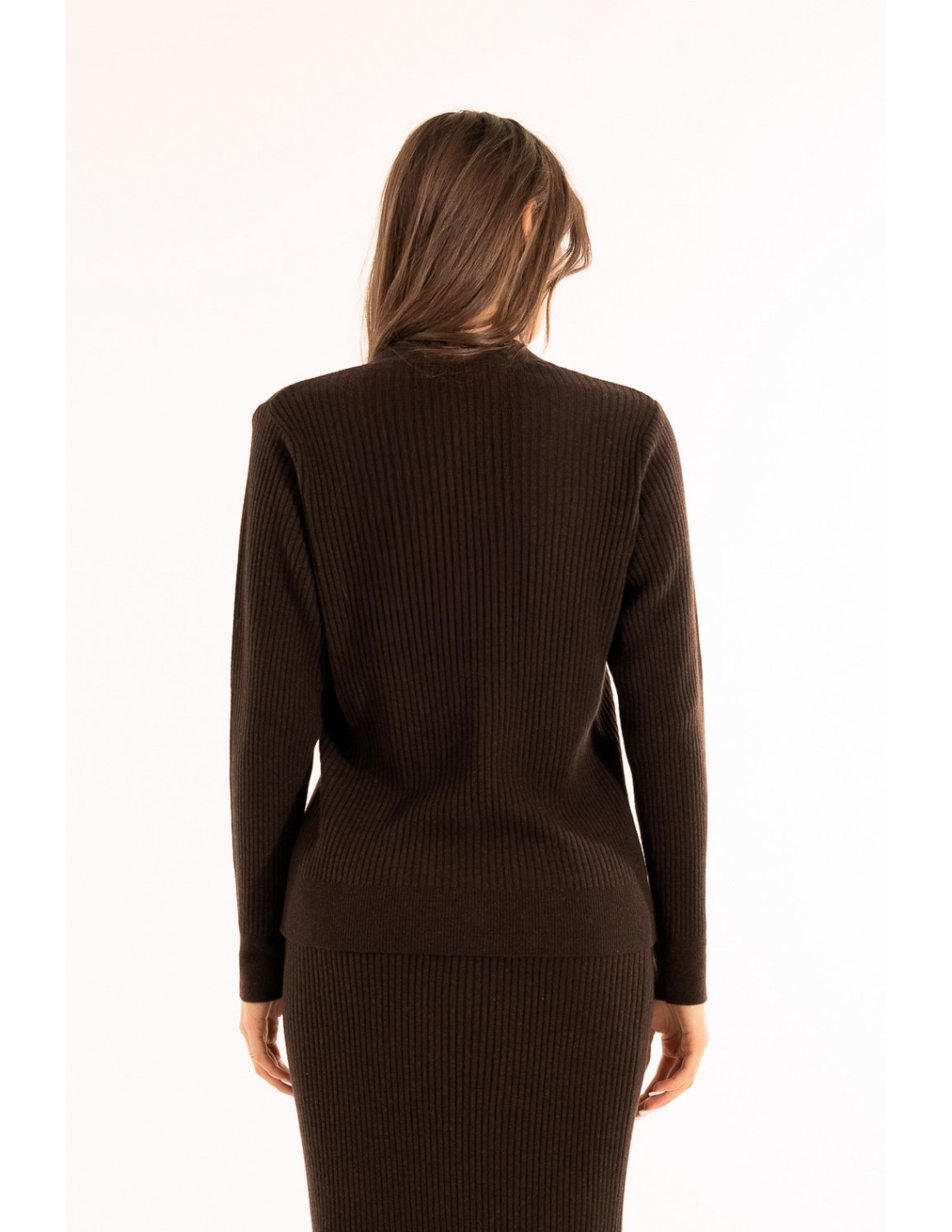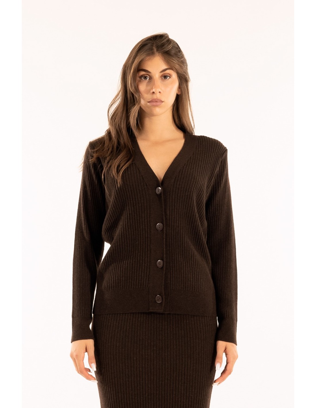 Kontatto interpreta a malharia com uma silhueta macia e feminina: corte regular que envolve sem apertar, trabalhada em canelado elástico em fio macio. Decote em V que alonga e botões tom sobre tom, punhos e barra em canelado mais estreito para definir a linha. Perfeito para o escritório e para o dia a dia, também coordenado com saias ou denim.