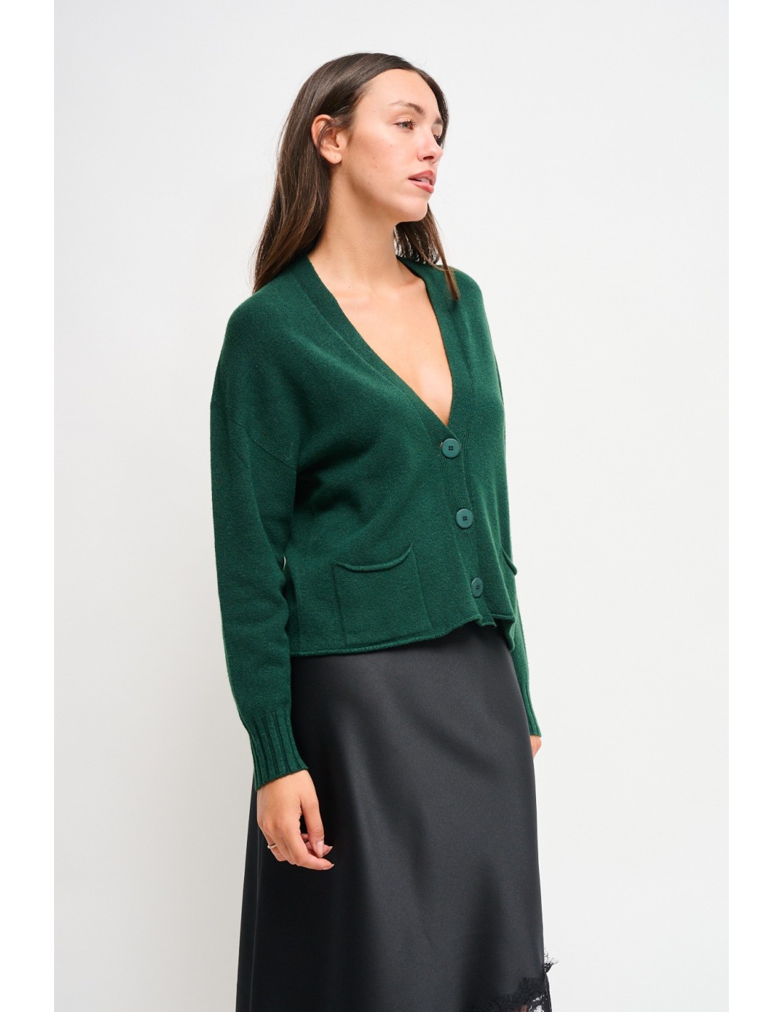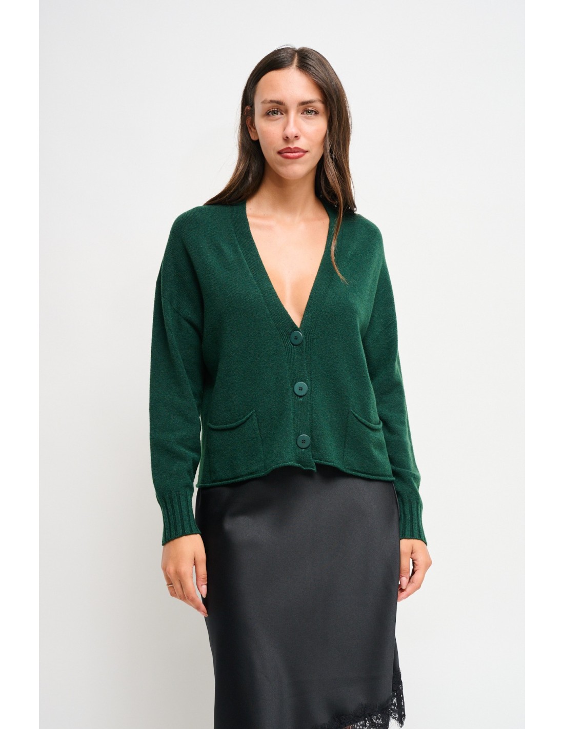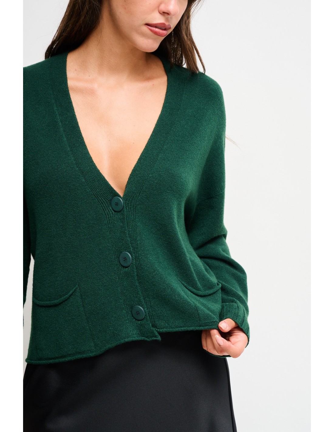 Maryley assina uma peça macia e envolvente com um corte relaxado e curto. Malha macia efeito peluche com acabamento canelado no decote em V profundo e nos punhos. Botões maxi e bolsos aplicados definem a silhueta com praticidade. Perfeito com denim para o dia a dia ou com saia de cetim para o escritório e o aperitivo.