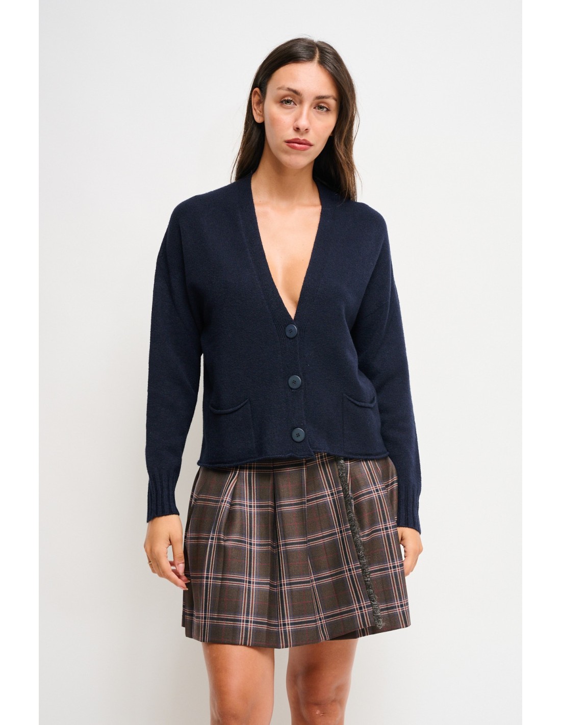 Maryley assina uma peça macia e envolvente com um corte relaxado e curto. Malha macia efeito peluche com acabamento canelado no decote em V profundo e nos punhos. Botões maxi e bolsos aplicados definem a silhueta com praticidade. Perfeito com denim para o dia a dia ou com saia de cetim para o escritório e o aperitivo.