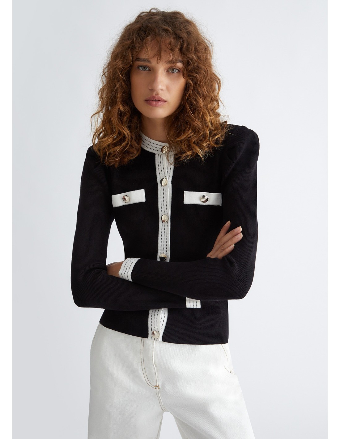 Cardigan em malha, gola redonda, ribetes em contraste, mangas compridas.