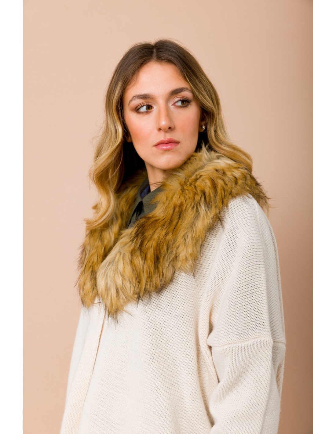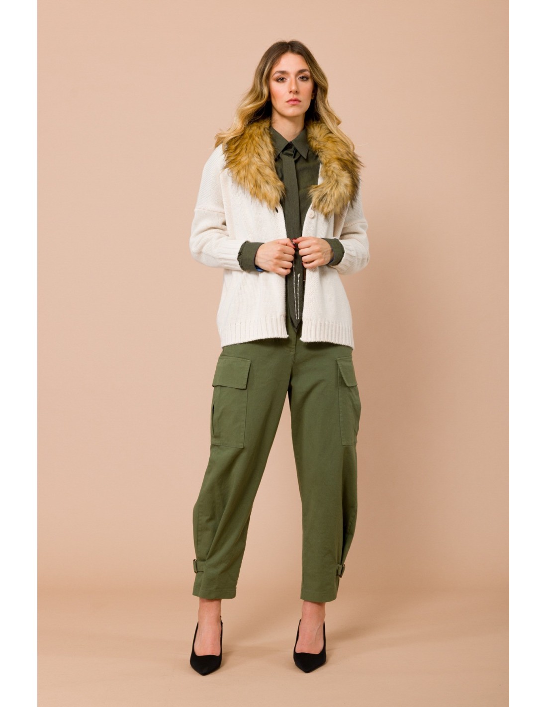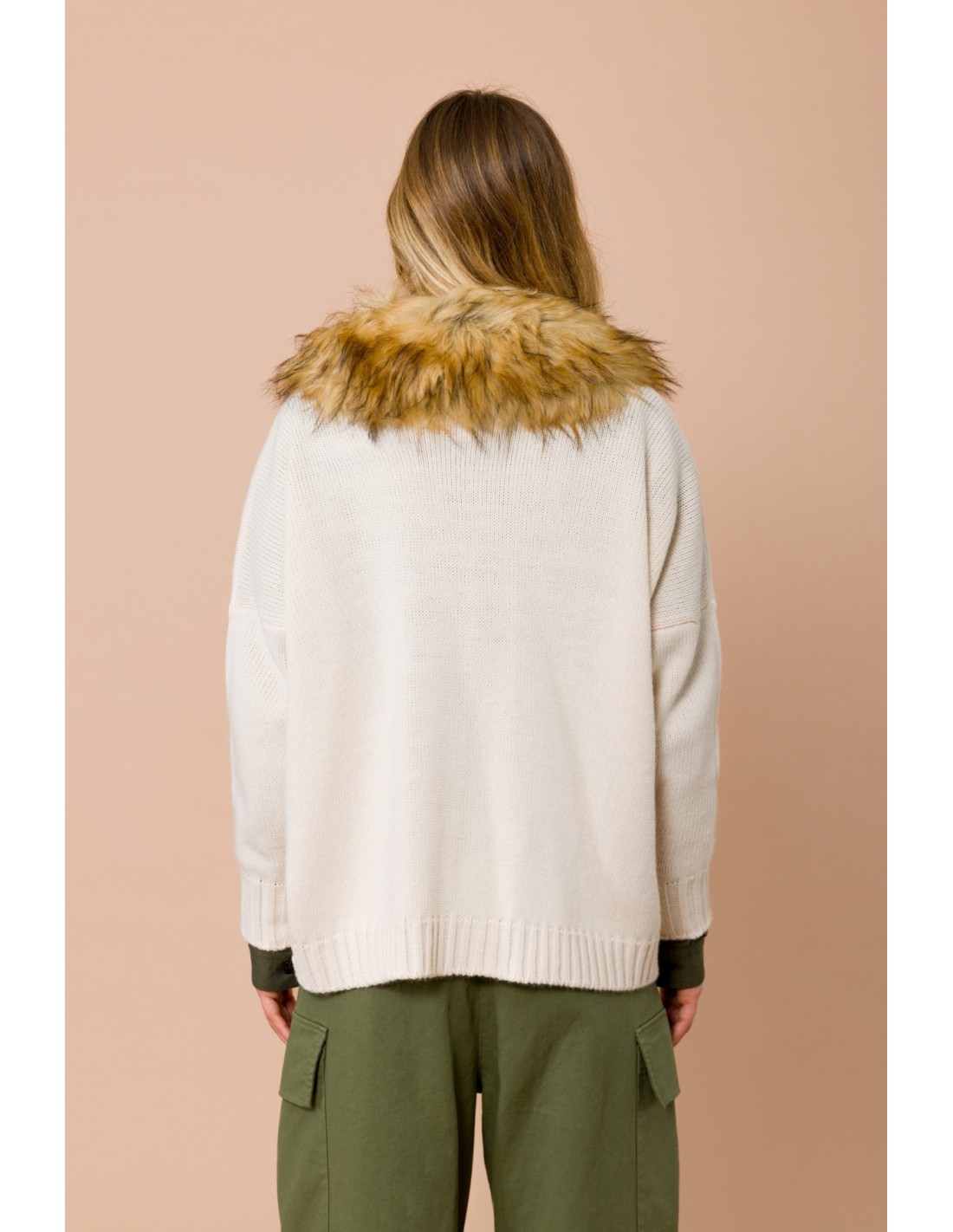Maryley assina um cardigan macio de corte descontraído, em malha compacta que envolve sem pesar. Gola em pele sintética removível e decote em V com botões frontais definem a silhueta e acrescentam carácter. Perfeito do escritório ao aperitivo: conforto quente, estilo versátil em qualquer look.
