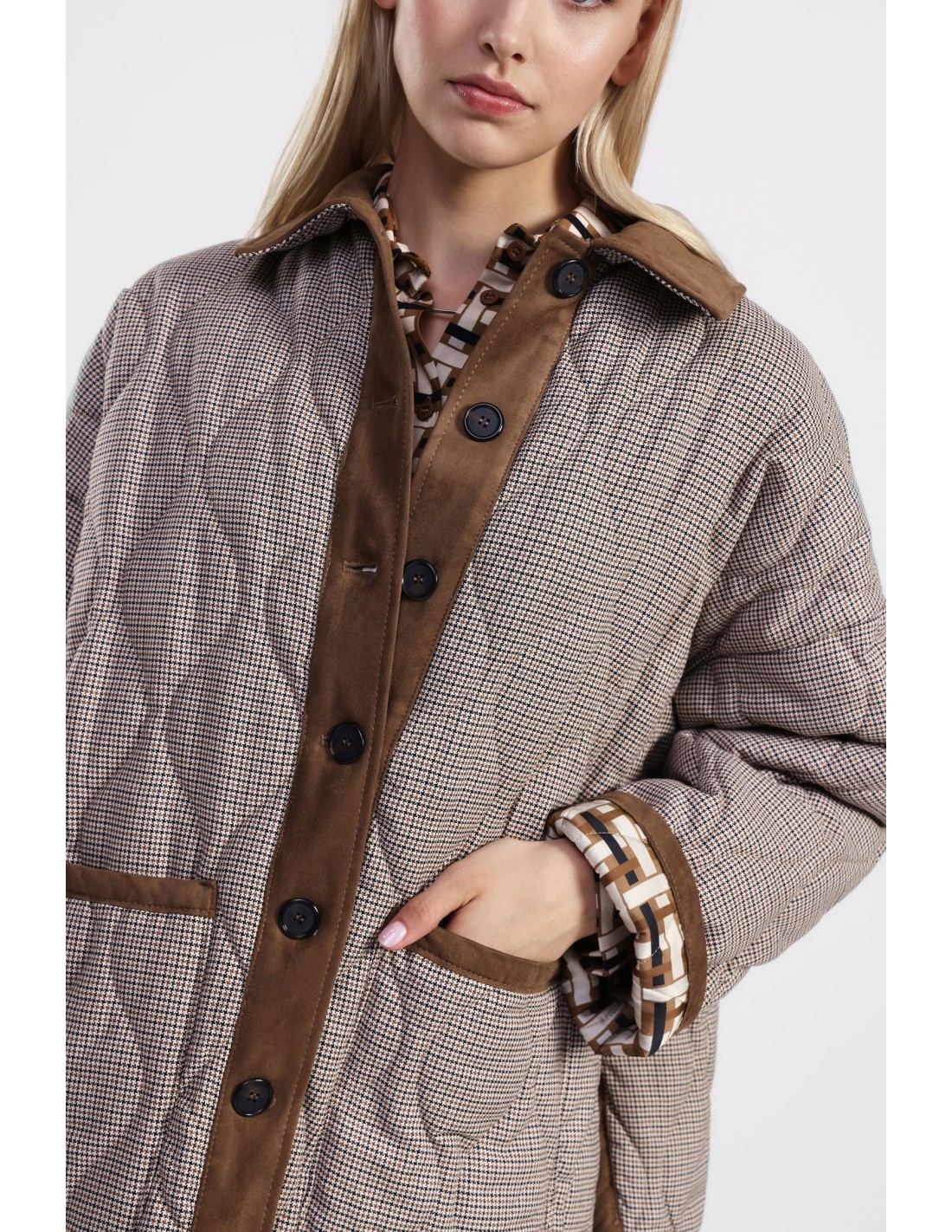 Este casaco acolchoado é uma mistura perfeita de funcionalidade e estilo. Com o seu design estampado e fecho de botões, envolve-a num look requintado e casual. Os detalhes práticos, como os bolsos grandes à frente, tornam-no ideal para o dia a dia, enquanto o acabamento sofisticado acrescenta um toque de originalidade ao seu guarda-roupa.