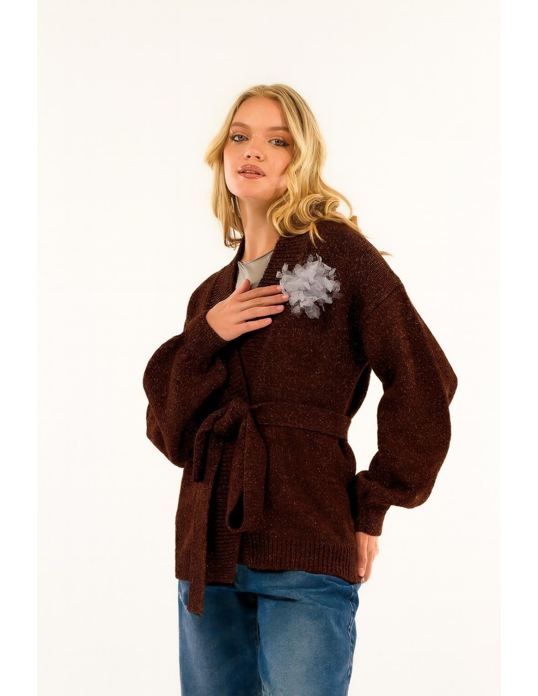 Kontatto interpreta as malhas com um tricô envolvente com um ajuste suave, definido na cintura por um cinto amovível para uma silhueta feminina. Fio macio com filigrana brilhante e textura bouclé. Pormenor de flores aplicado e mangas volumosas com punhos. Perfeito do escritório para o aperitivo, mesmo como roupa exterior leve.
