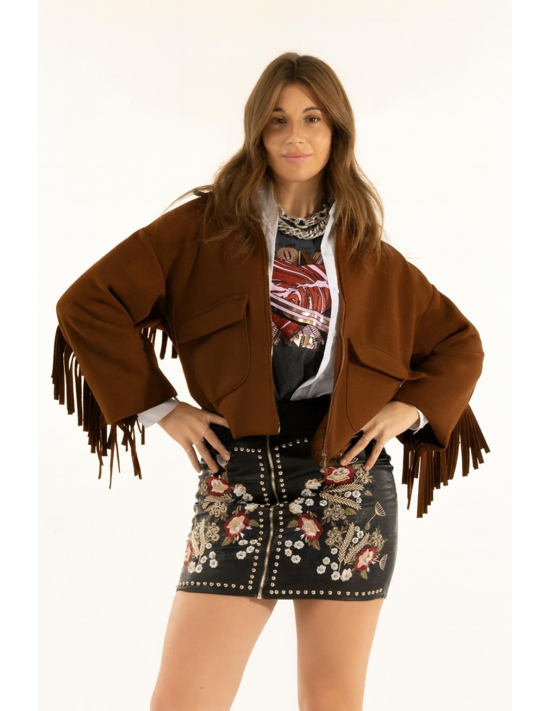 Kontatto assina um casaco de corte curto e descontraído, em tecido macio com efeito feltro para conforto e estrutura. Franjas ao longo das mangas e das costas, bolsos maxi com aba e fecho frontal oferecem movimento e praticidade. Perfeito com denim ou vestidos para o dia a dia com carácter e para noites casual‑chic.