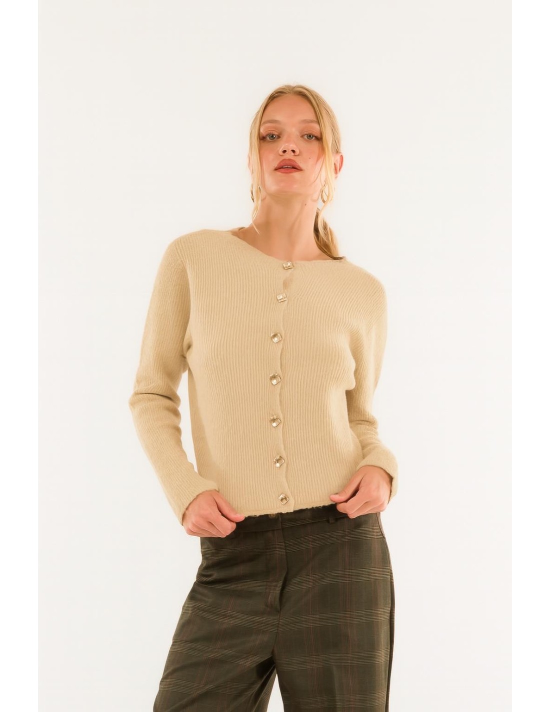 Deixe-se envolver pelo charme refinado desta camisola: um corte moderno e essencial, embelezado com botões de jóias que dão um toque refinado a cada roupa. Perfeita para dar classe e personalidade ao seu look do dia a dia.