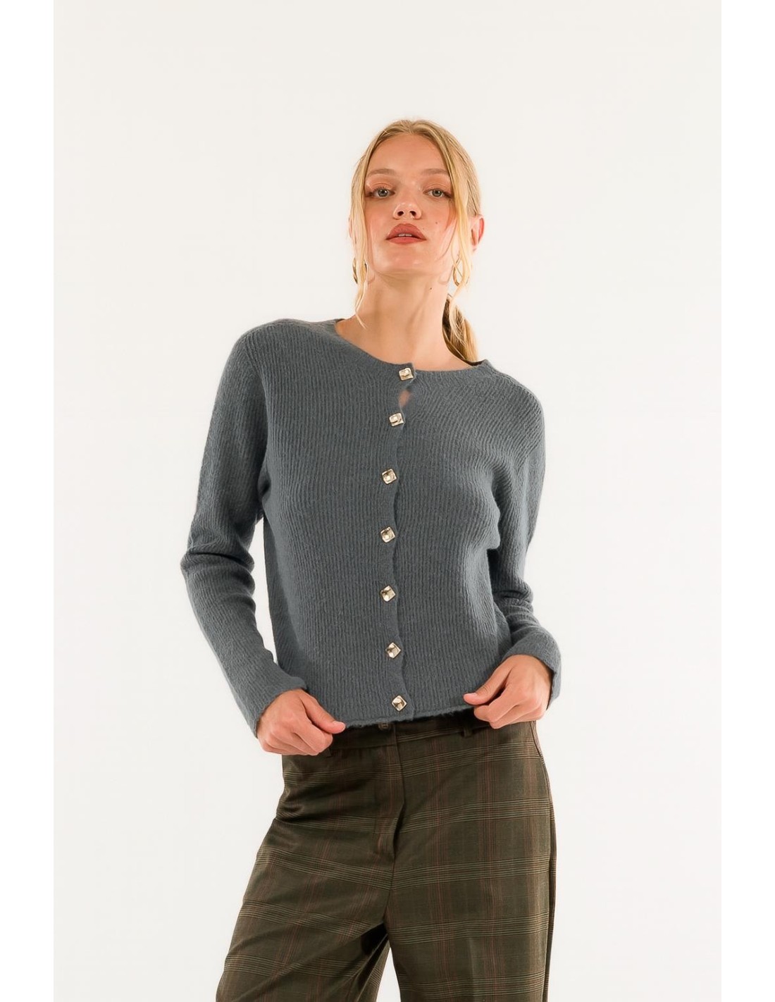 Deixe-se envolver pelo charme refinado desta camisola: um corte moderno e essencial, embelezado com botões de jóias que dão um toque refinado a cada roupa. Perfeita para dar classe e personalidade ao seu look do dia a dia.