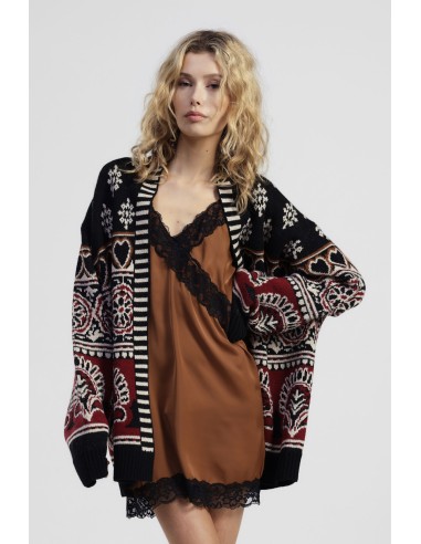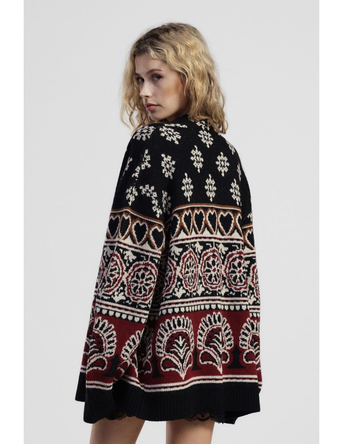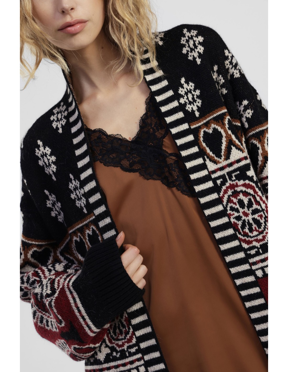 Casaco de malha com espírito original, caracterizado por um trabalho em jacquard rico em motivos gráficos e detalhes florais. O seu corte descontraído e os bordos às riscas dão-lhe um toque vivo e adapta-se facilmente a looks diurnos e informais. Perfeito para exprimir a sua personalidade com um estilo autêntico.