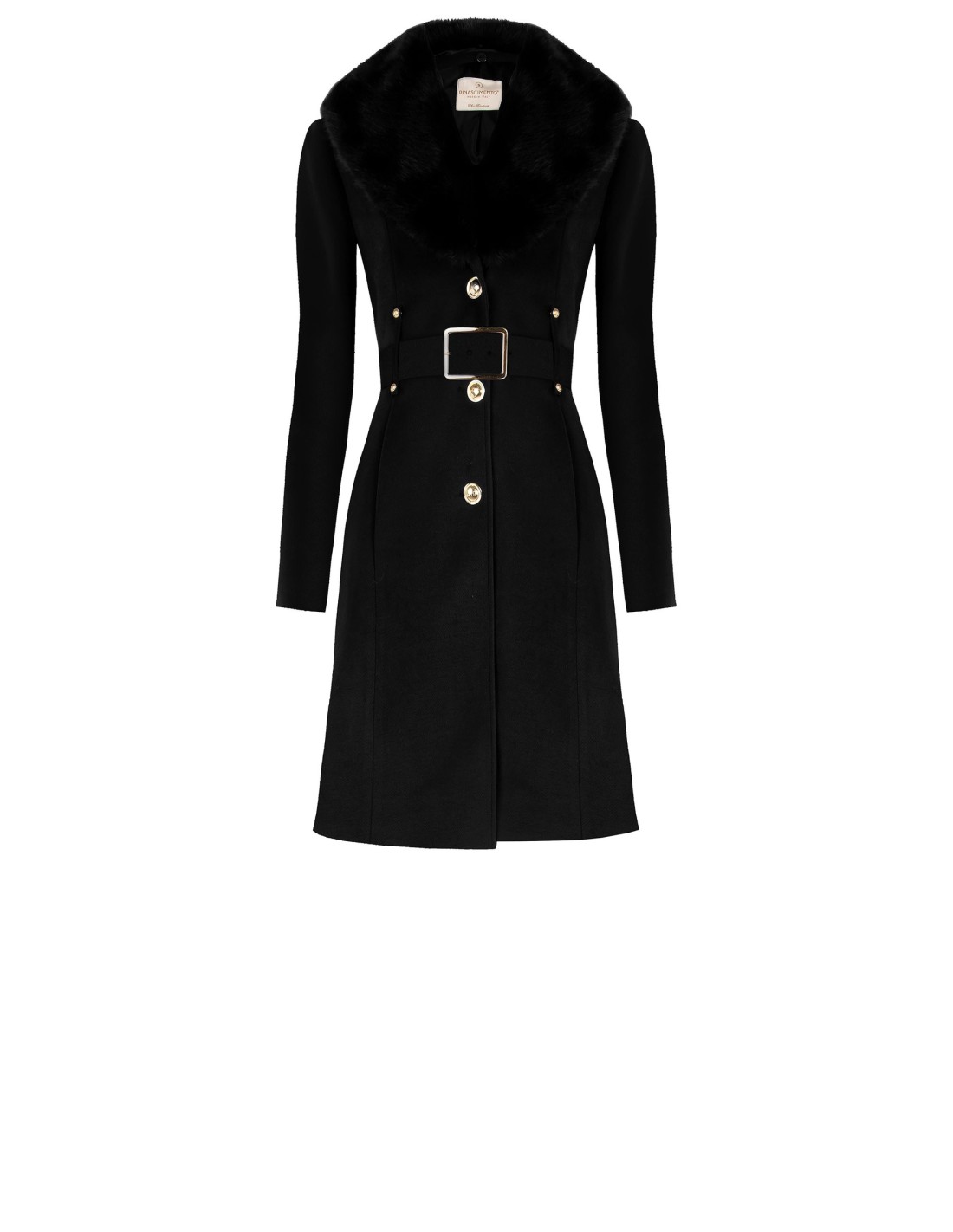Casaco longo acinturado em veludo com gola em pêlo sintético removível e cinto em pele sintética Rinascimento