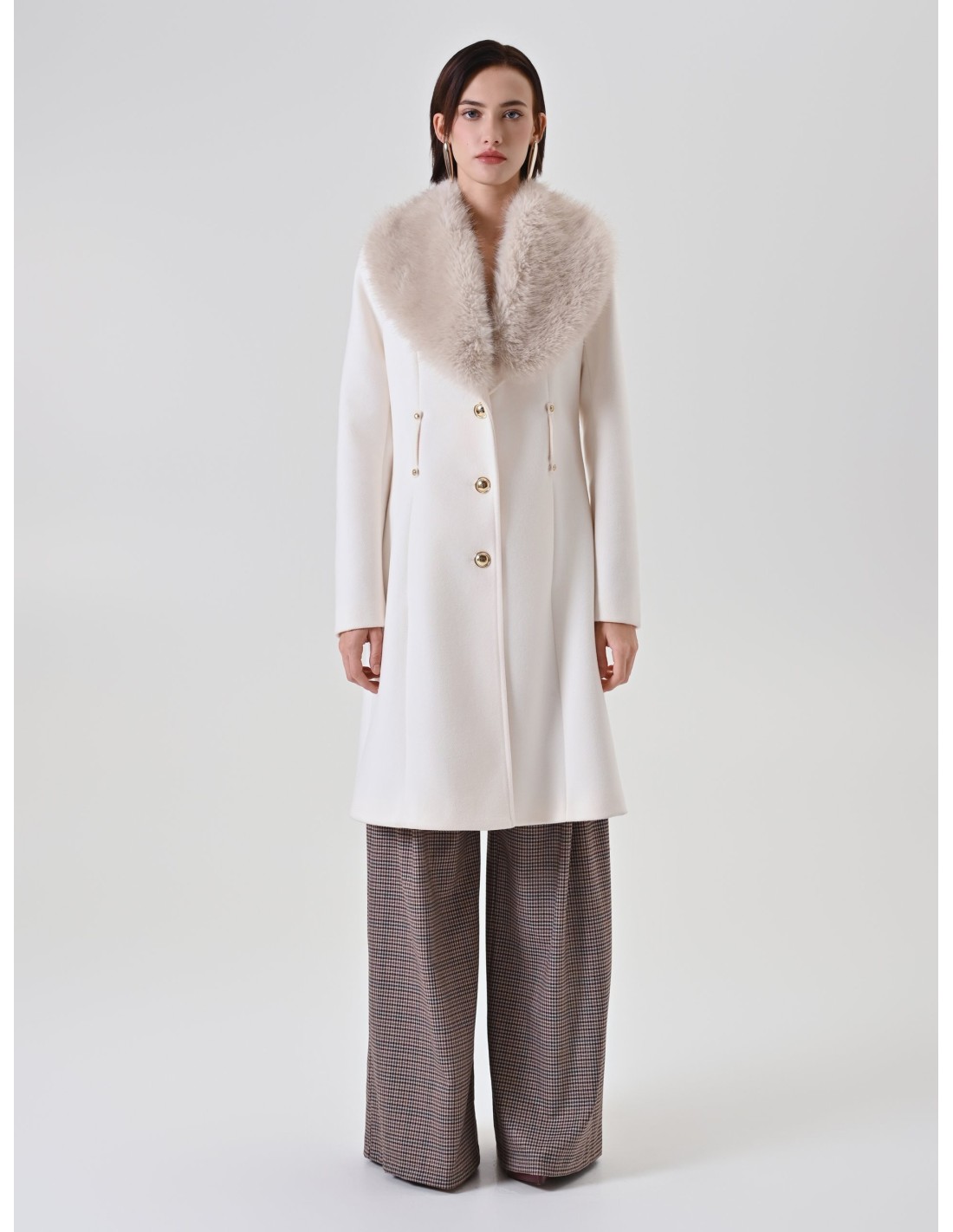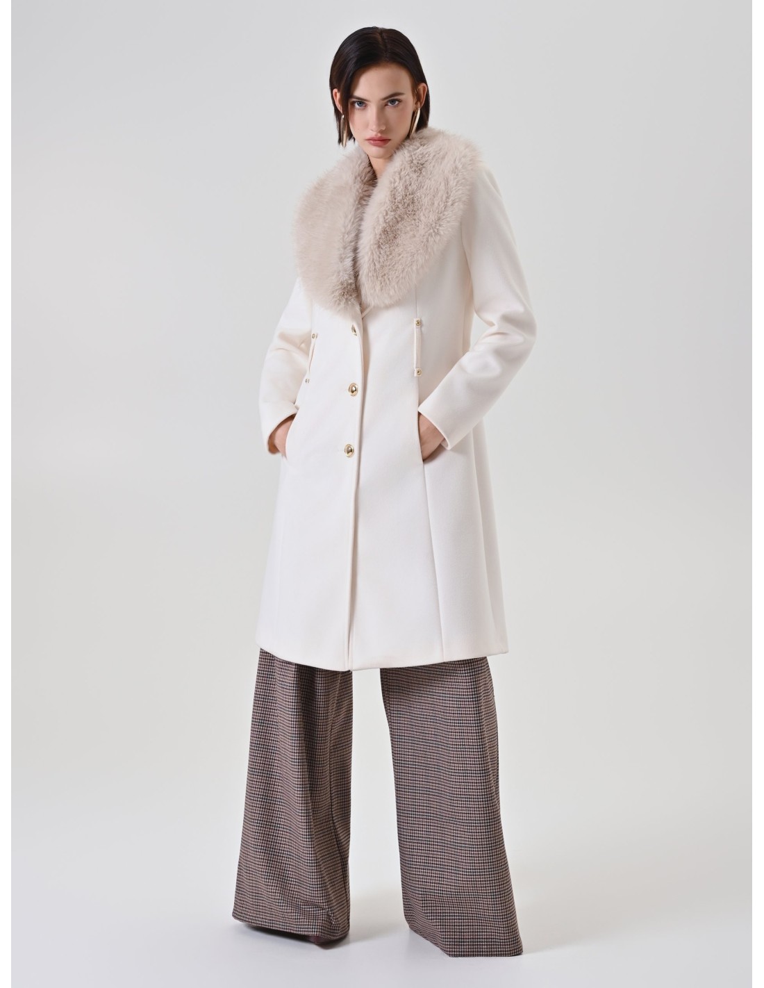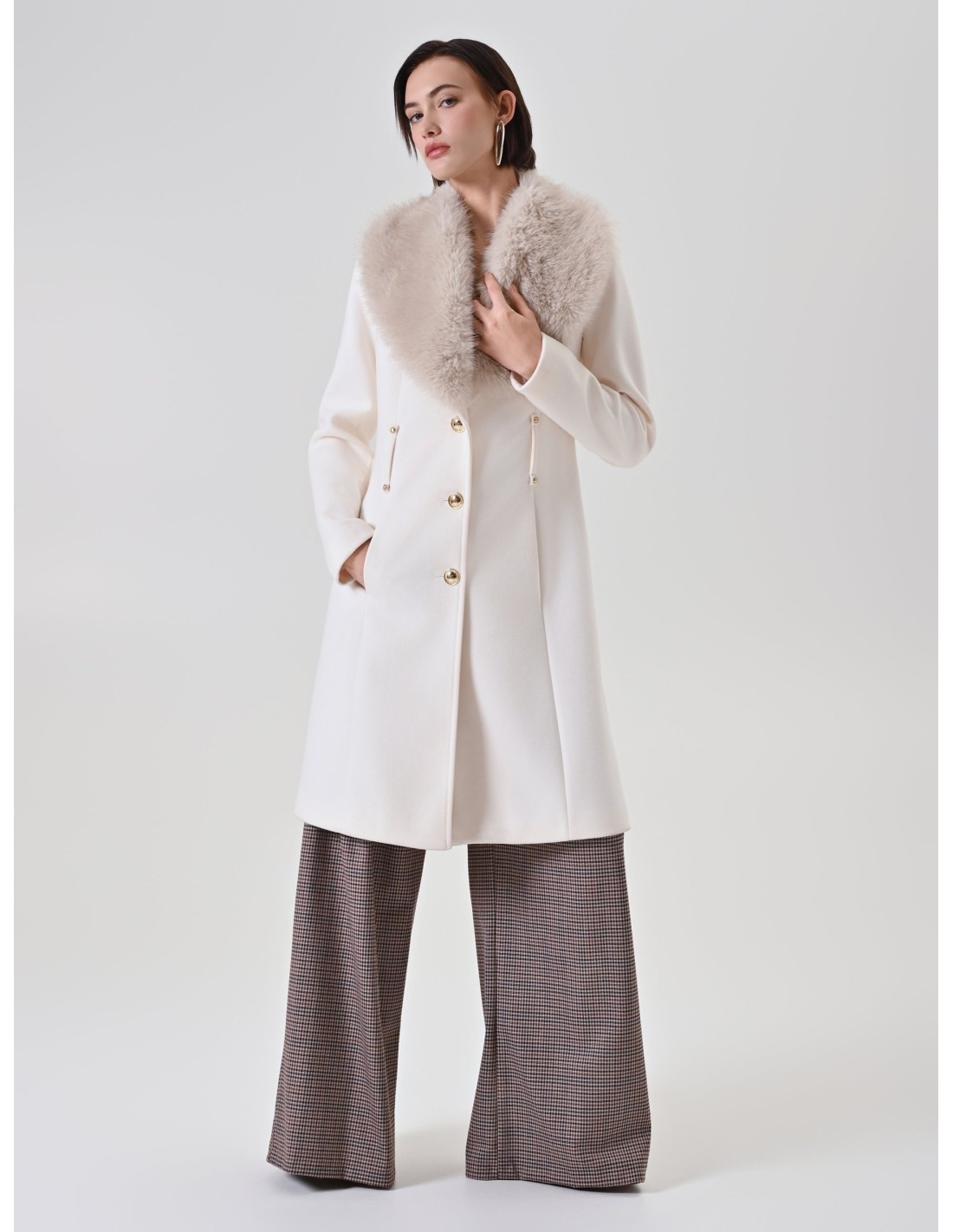 Casaco com corte acinturado que valoriza a silhueta. Velour macio com efeito aveludado, quente e confortável. Gola em pele ecológica removível e cinto em pele sintética com fivela metálica para definir a cintura. Botões joia frontais. Perfeito do escritório a eventos noturnos, também sobre vestidos.