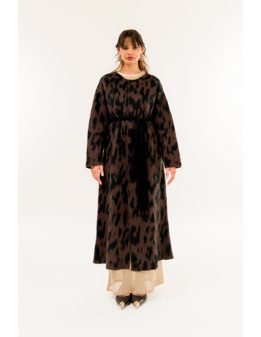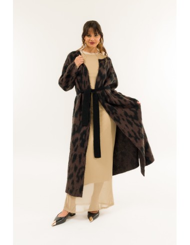 Kontatto assina um casaco comprido, macio e confortável, com um corte descontraído que adelgaça a silhueta. Fio macio com efeito plush e motivo animal. Cinto de cintura amovível e decote redondo limpo. Perfeito sobre calças de ganga e vestidos, do escritório aos aperitivos, para looks quentes e decisivos.