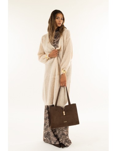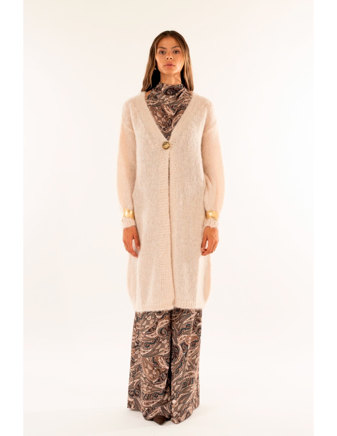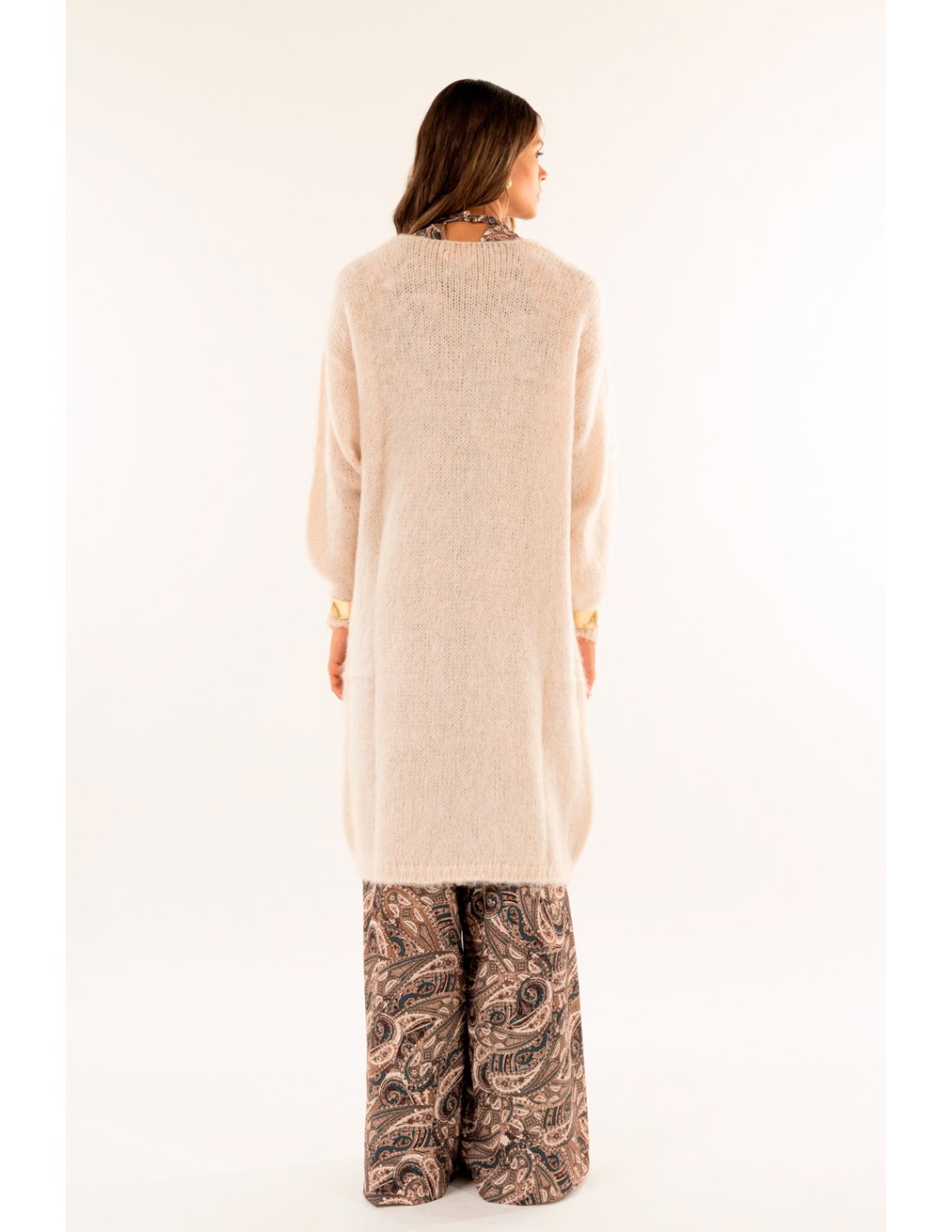 Kontatto assina uma peça de vestuário comprida e envolvente, com um corte suave que adelgaça a silhueta. Malha macia com efeito mohair, muito leve e quente. Decote em V limpo com botão metálico maxi e bolsos laterais discretos. Perfeito sobre vestidos ou calças de ganga para o escritório e momentos de lazer, acrescenta conforto e feminilidade a todos os looks.