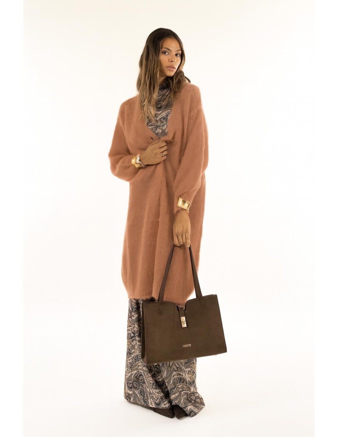 Kontatto assina uma peça de vestuário comprida e envolvente, com um corte suave que adelgaça a silhueta. Malha macia com efeito mohair, muito leve e quente. Decote em V limpo com botão metálico maxi e bolsos laterais discretos. Perfeito sobre vestidos ou calças de ganga para o escritório e momentos de lazer, acrescenta conforto e feminilidade a todos os looks.