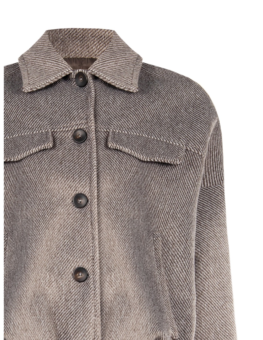 Casaco cropped de corte macio e arredondado que realça a cintura com bainha franzida. Toque macio com efeito veludo e textura diagonal, confortável e leve. Gola clássica, botões frontais e bolsos com aba definem o estilo. Perfeita para o escritório com tailleur ou para o dia a dia com denim e ténis.