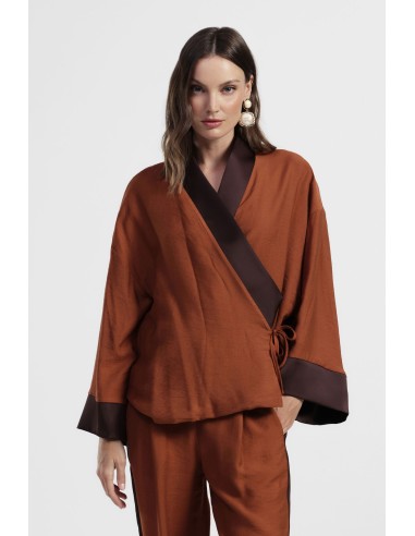 Corte quimono e silhueta suave para este casaco curto adornado com debrum em contraste na gola e nos punhos. O fecho com laço lateral dá um toque requintado e original. Ideal para quem quer destacar-se todos os dias com um estilo sofisticado e confortável, perfeito sobre looks casuais ou mais estruturados.