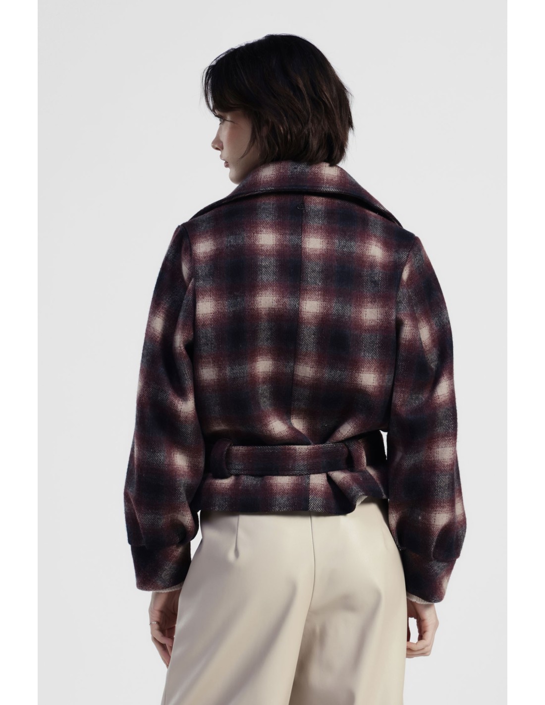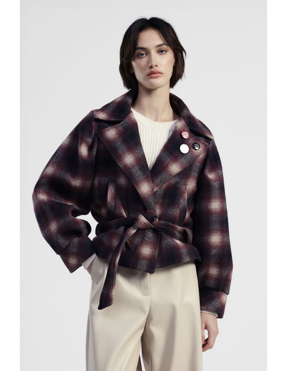 Um casaco curto de corte suave, valorizado por uma estampa xadrez esfumada e um cinto coordenado para uma silhueta sempre versátil. A gola ampla e os broches decorativos dão um toque original e pessoal, perfeito para completar looks do dia a dia com uma nota distintiva.