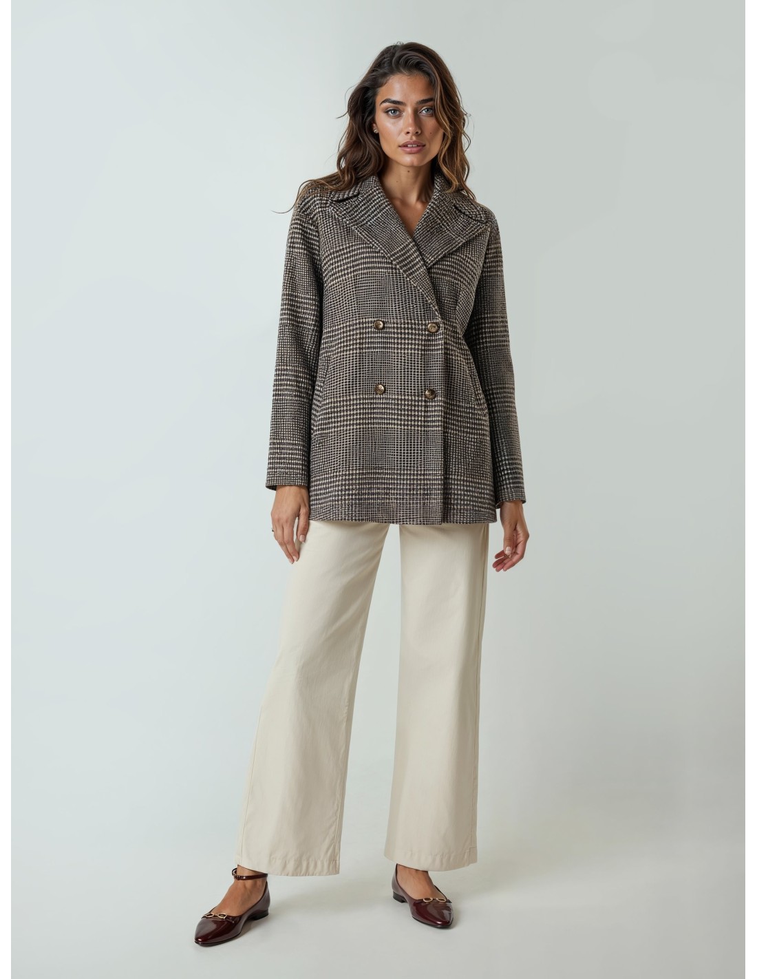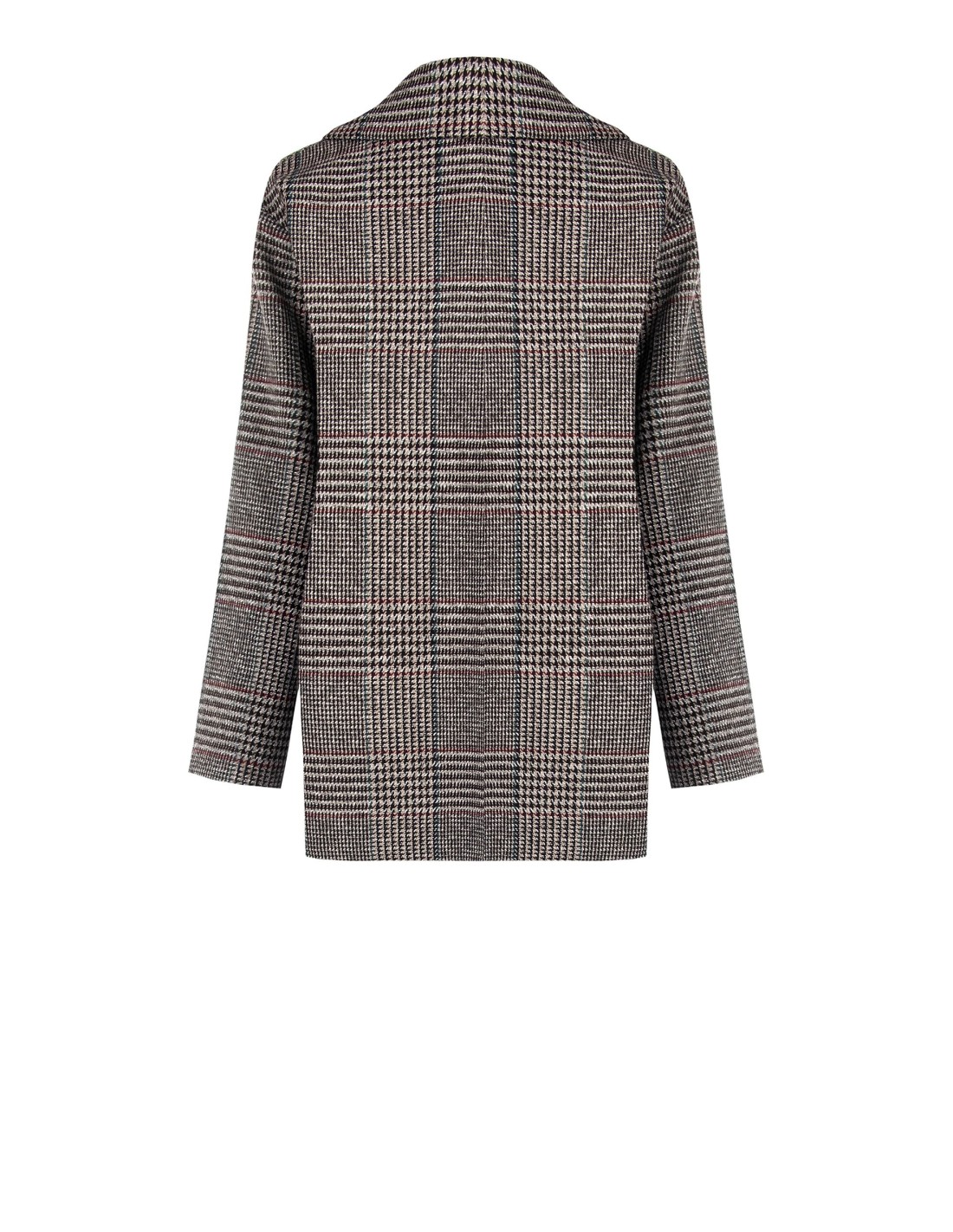 Casaco curto de corte recto e confortável, em macia trama Príncipe de Gales com interior forrado para um cair limpo. De peito duplo com botões com efeito chifre e amplas lapelas que alongam a silhueta. Perfeito com denim e peças de alfaiataria: do escritório ao aperitivo, confere estilo sem esforço.