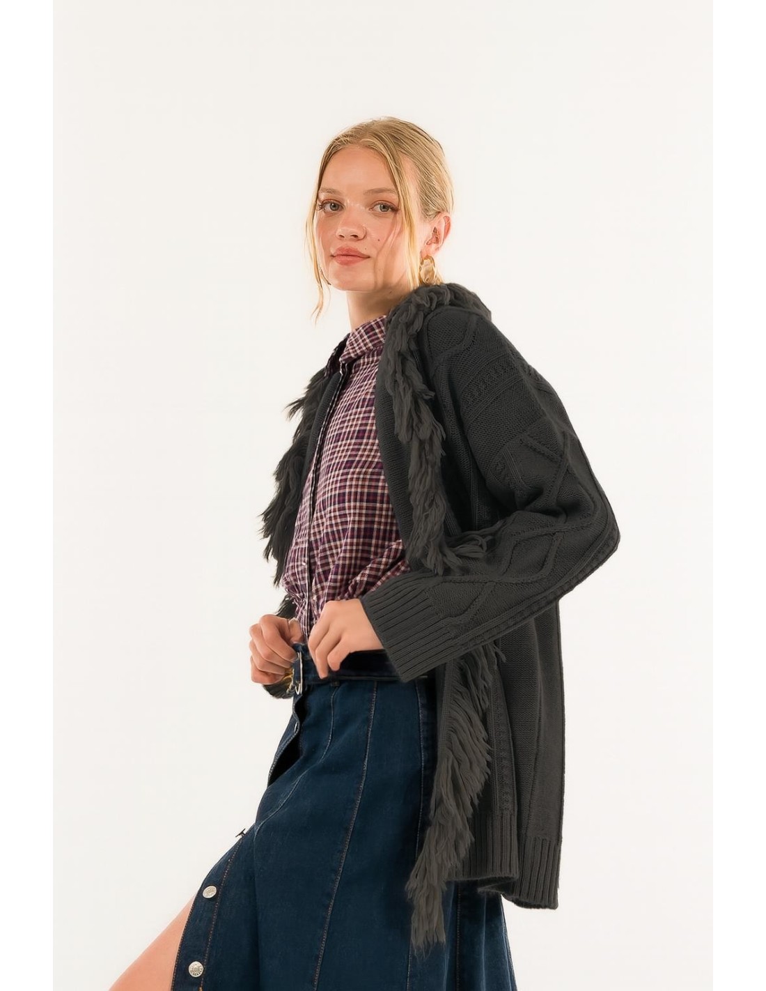 Um abraço de estilo envolvente: malhas requintadas com pormenores de franjas que dão movimento e um toque de personalidade. Perfeito para se destacar com charme em qualquer ocasião, de manhã à noite. Elegância e conforto encontram-se, deixe-se cativar.