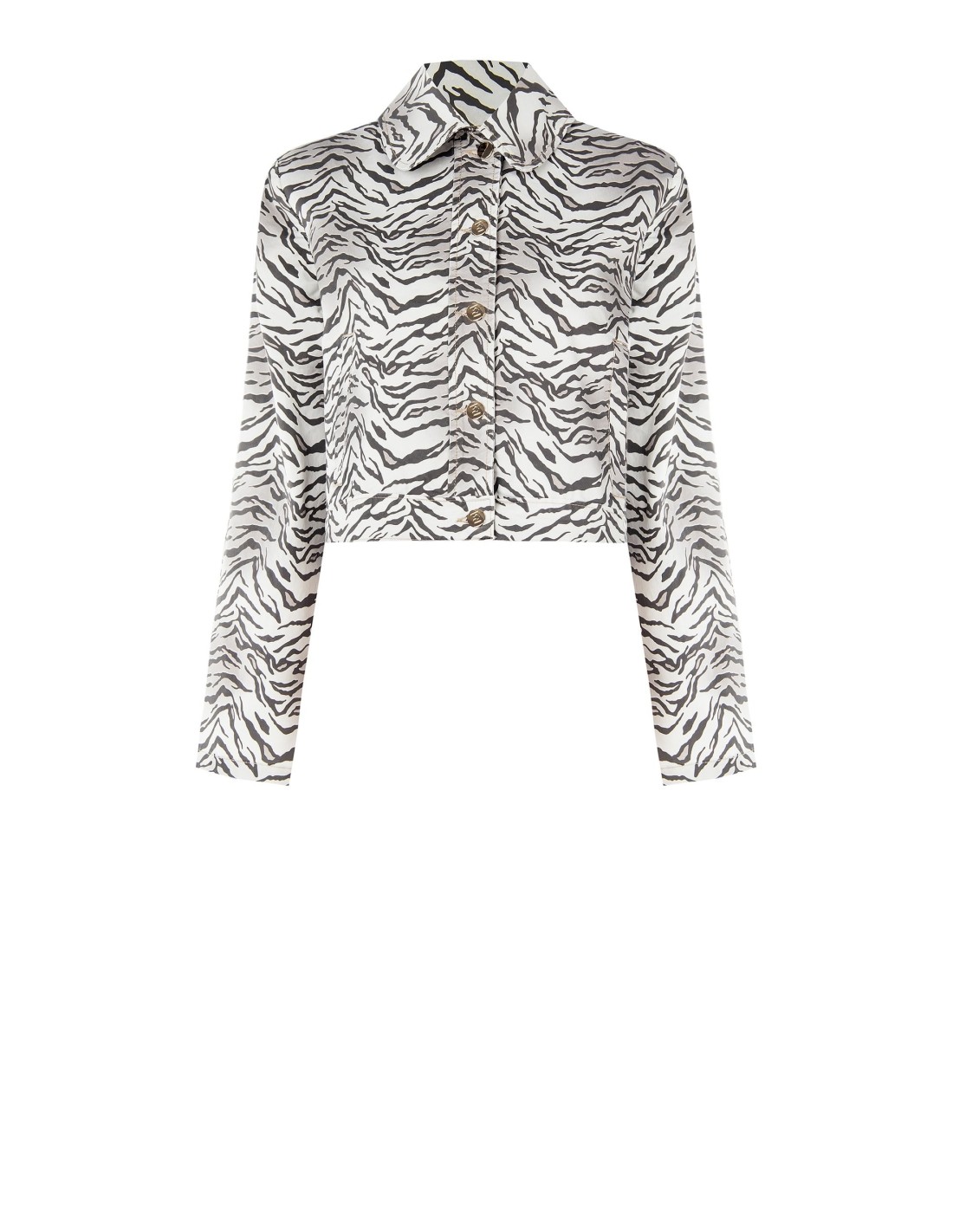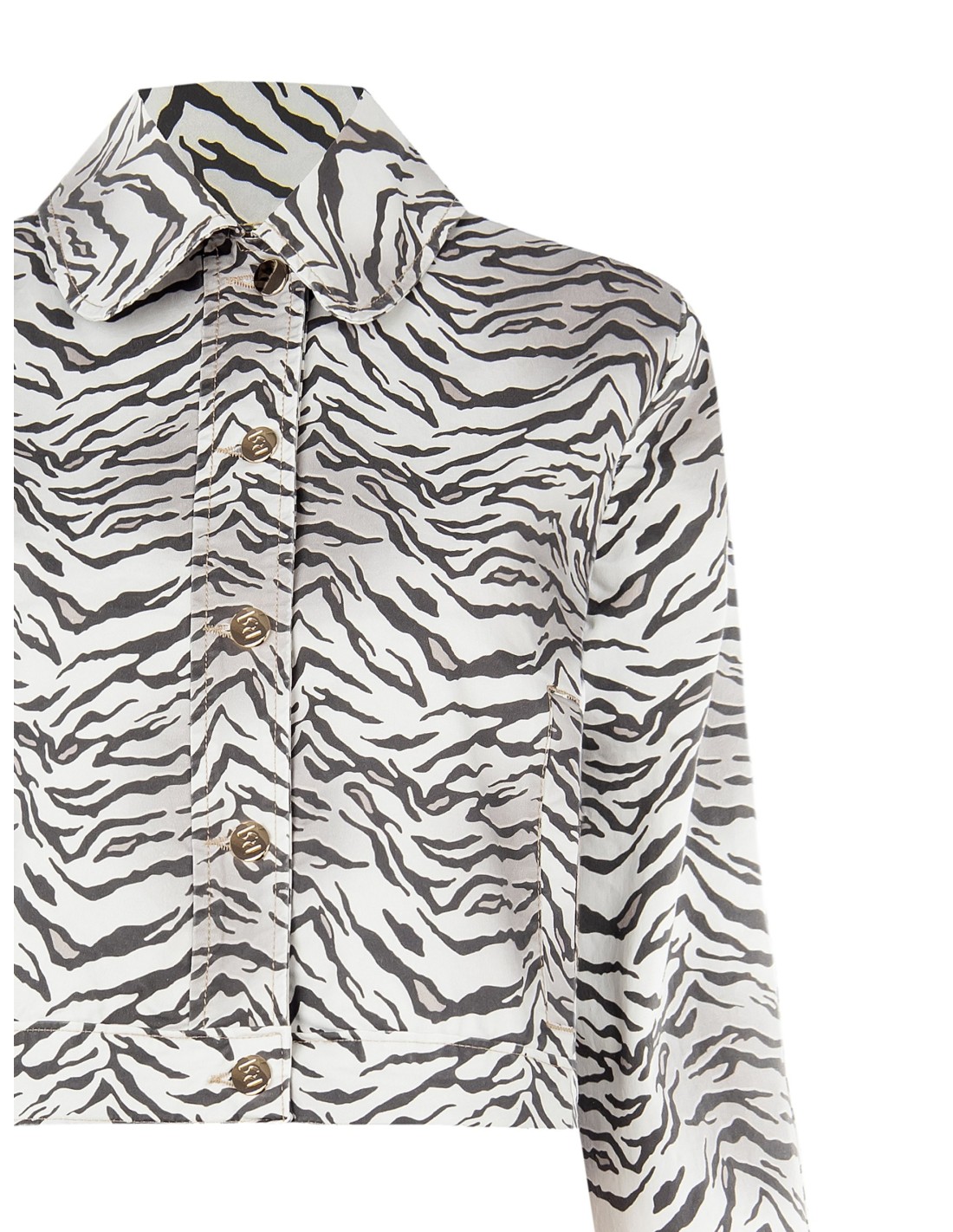 Casaco cropped de corte justo, em denim elástico com textura macia e confortável. O colarinho clássico e o fecho com botões valorizam a silhueta, enquanto a estampa animalier acrescenta carácter. Perfeito para o dia a dia, do escritório ao fim de semana.