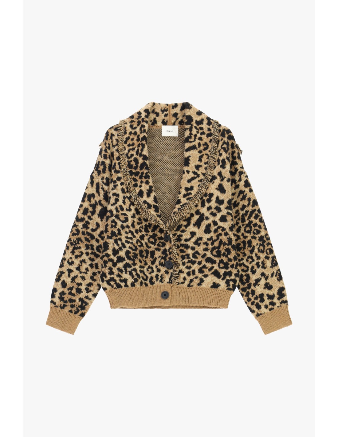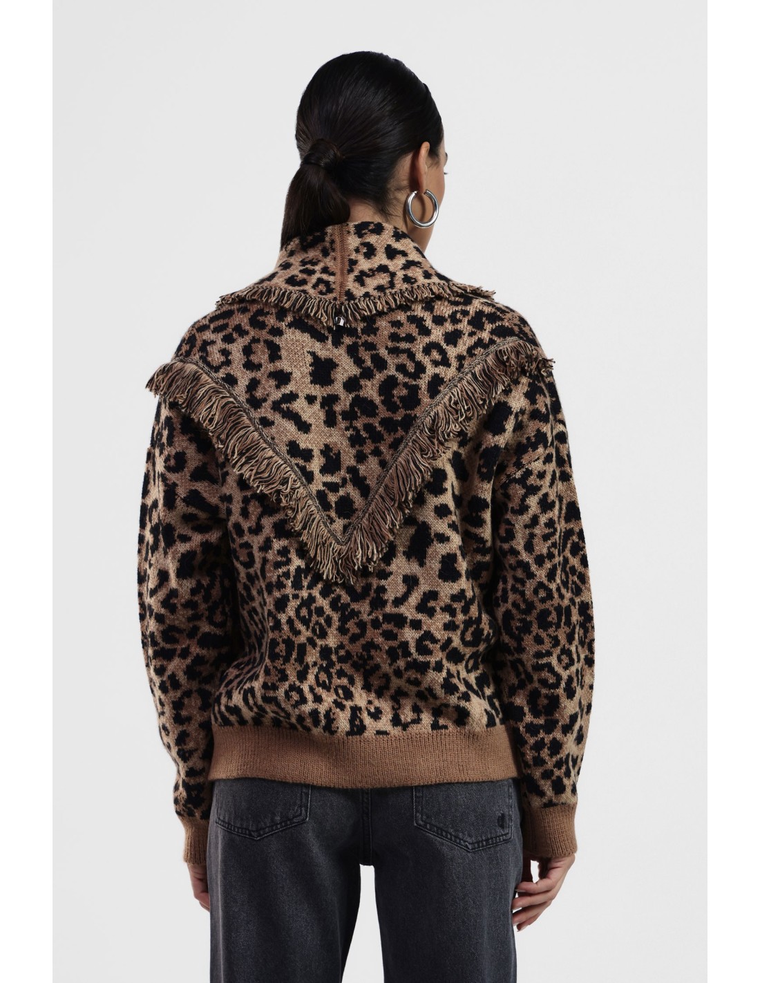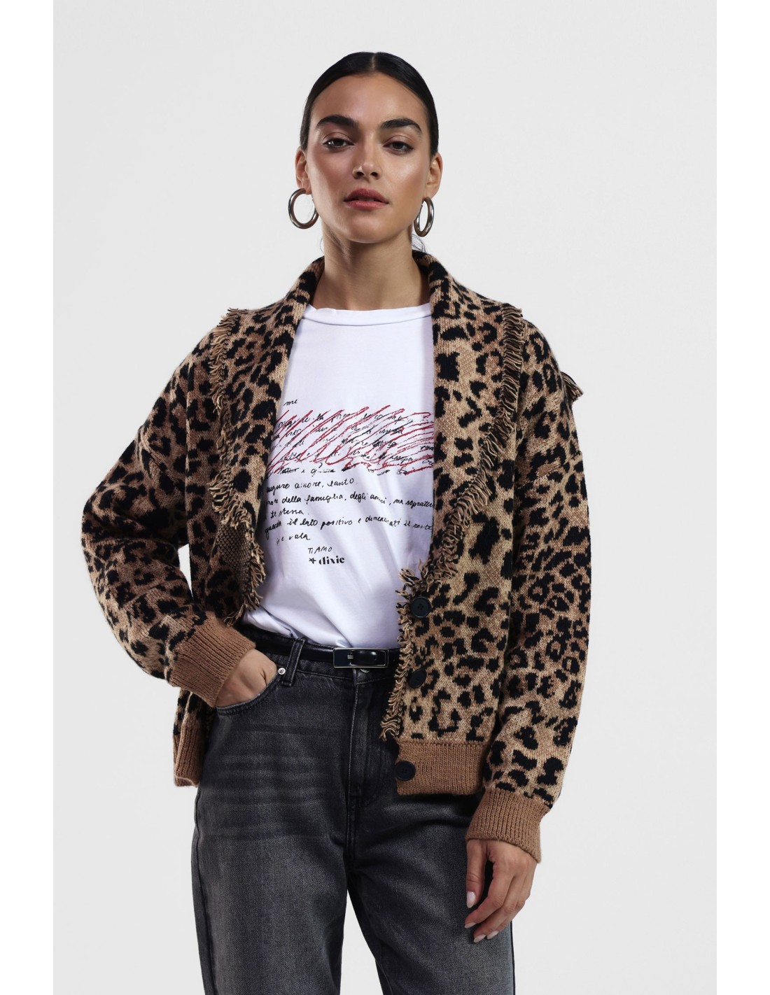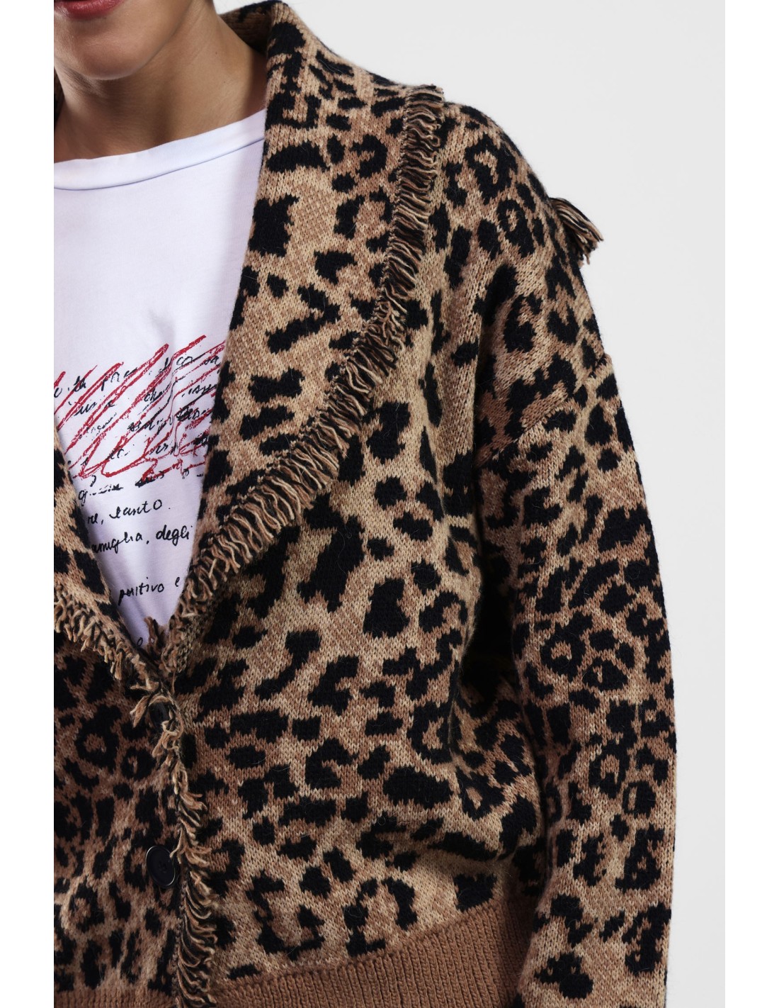 Descubra o casaco de malha com um motivo animal distinto e uma gola de xaile quente. As franjas decorativas ao longo das extremidades dão um toque de originalidade, enquanto os botões grandes garantem um fecho prático e elegante. Perfeito para looks casuais e sofisticados, esta peça irá facilmente complementar o seu guarda-roupa do dia a dia.