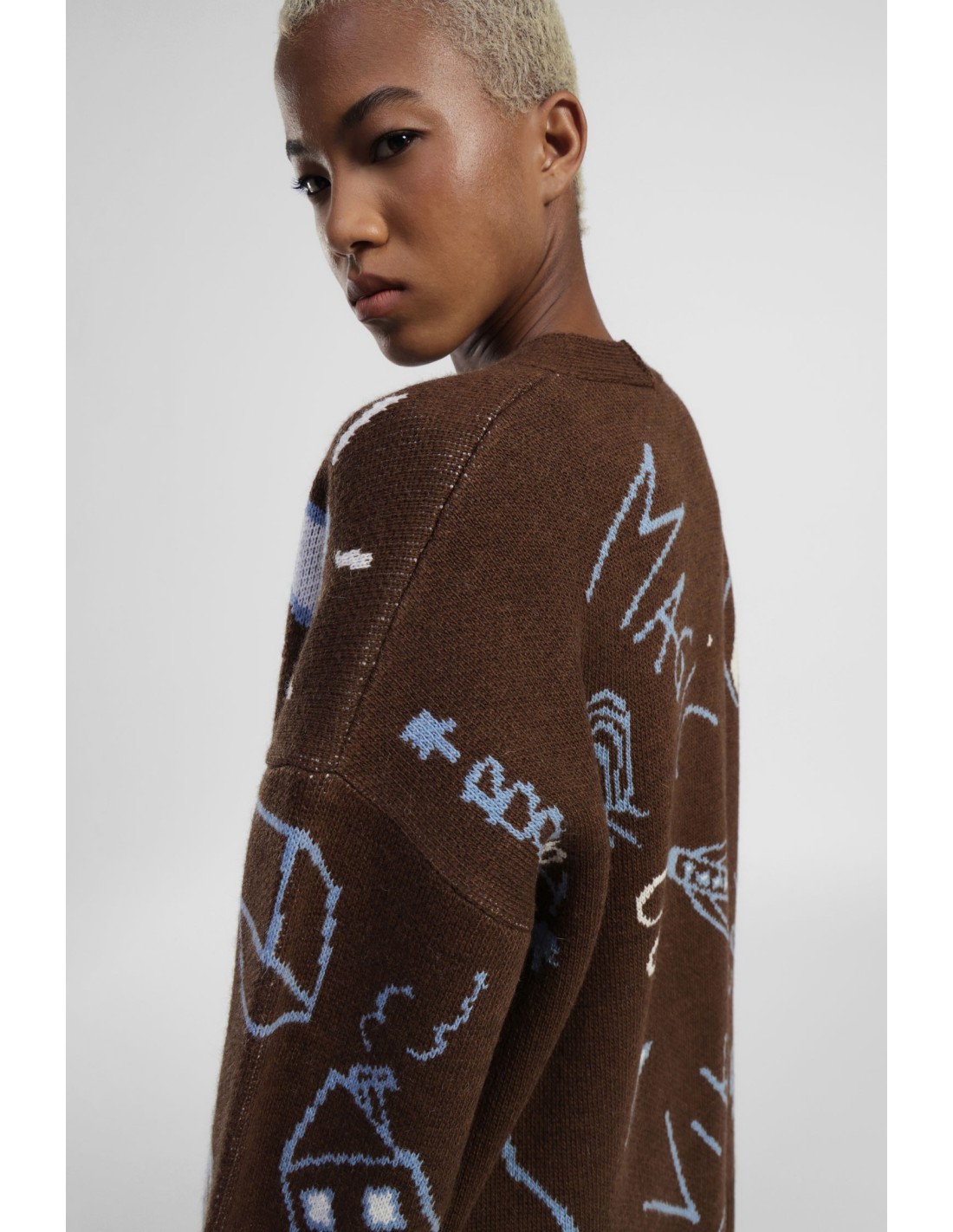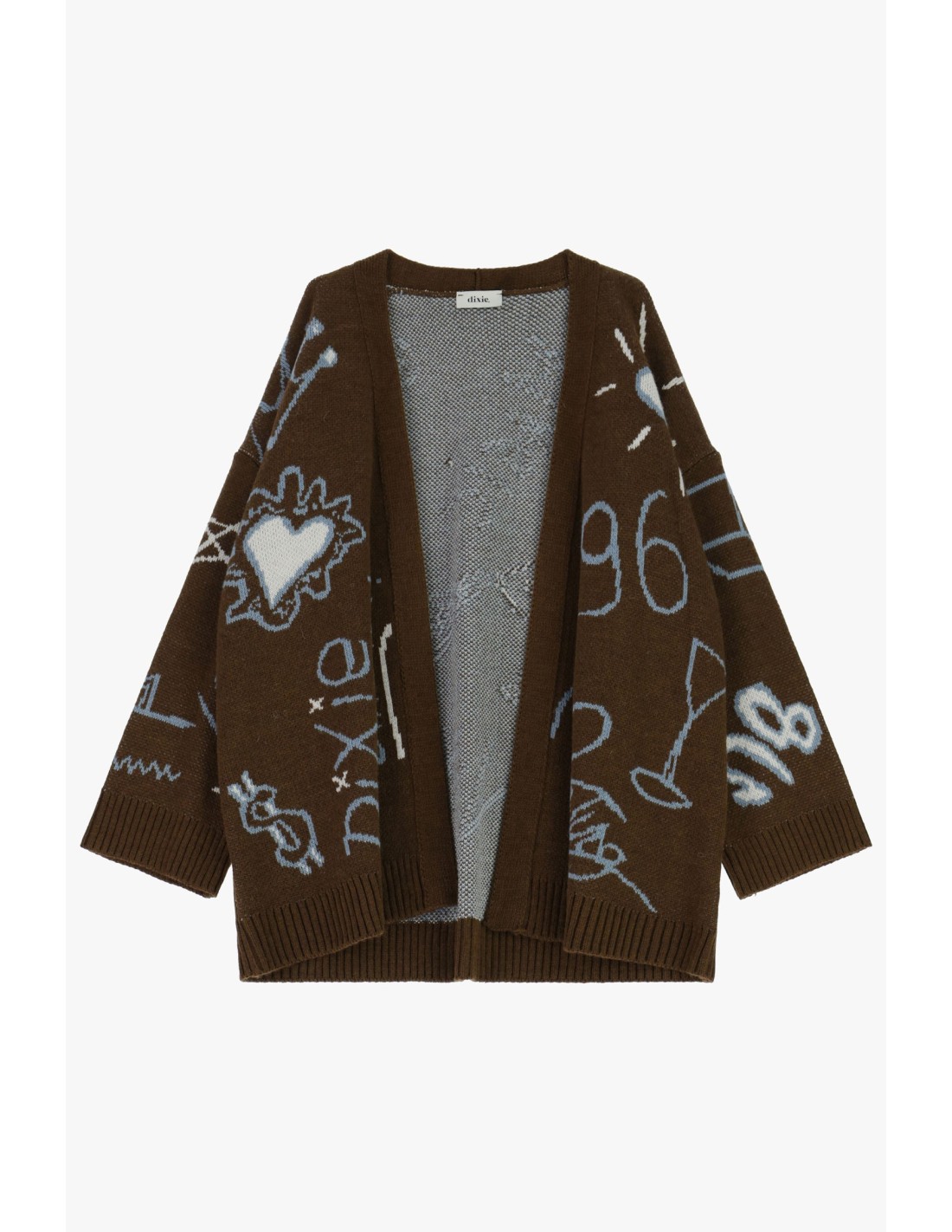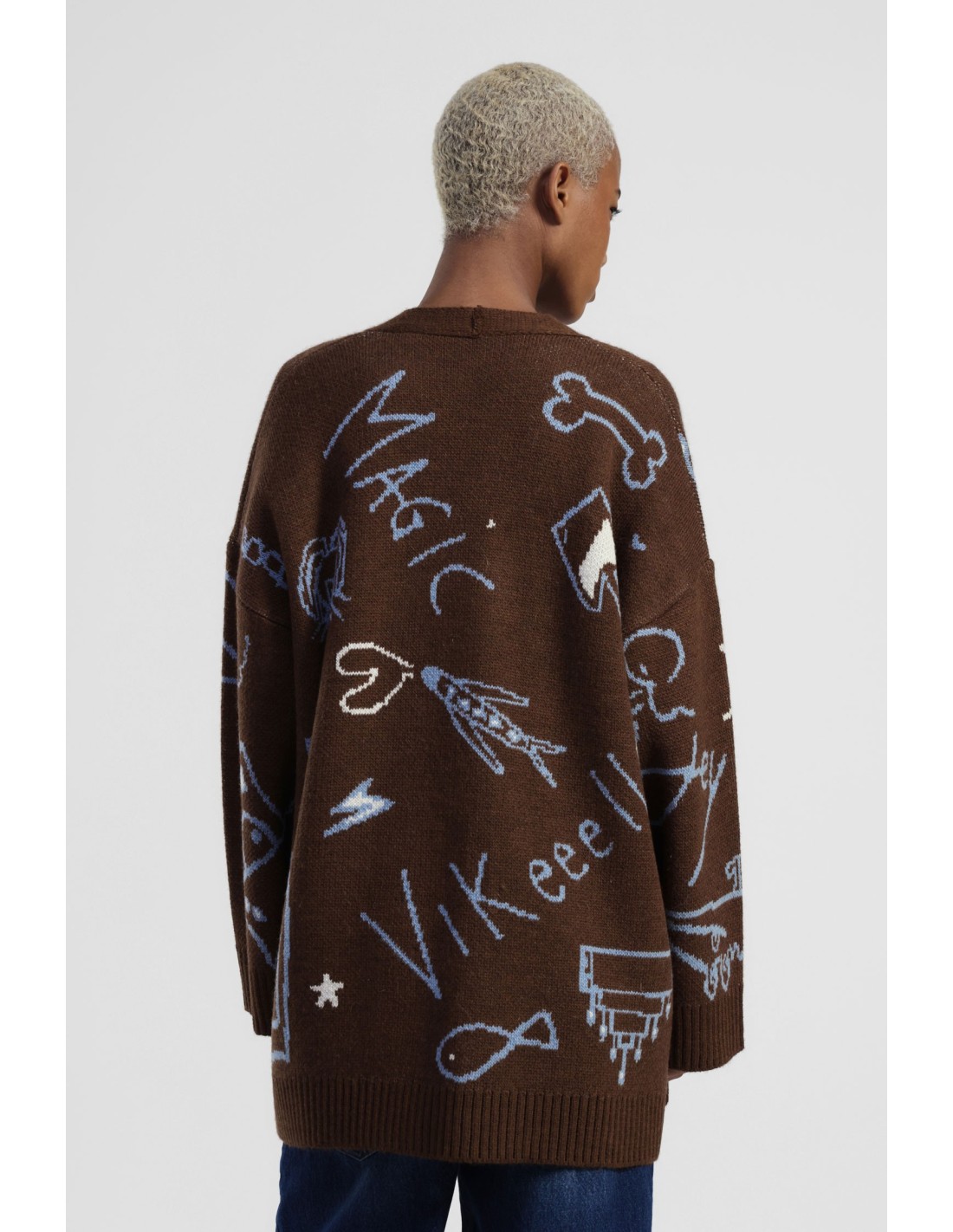 Cardigã de corte largo com mangas compridas e bainhas caneladas, embelezado com motivos gráficos em todo o lado que dão um toque criativo ao seu look diário. Perfeito para usar por cima de tops e camisas para dar personalidade e conforto a qualquer hora do dia.