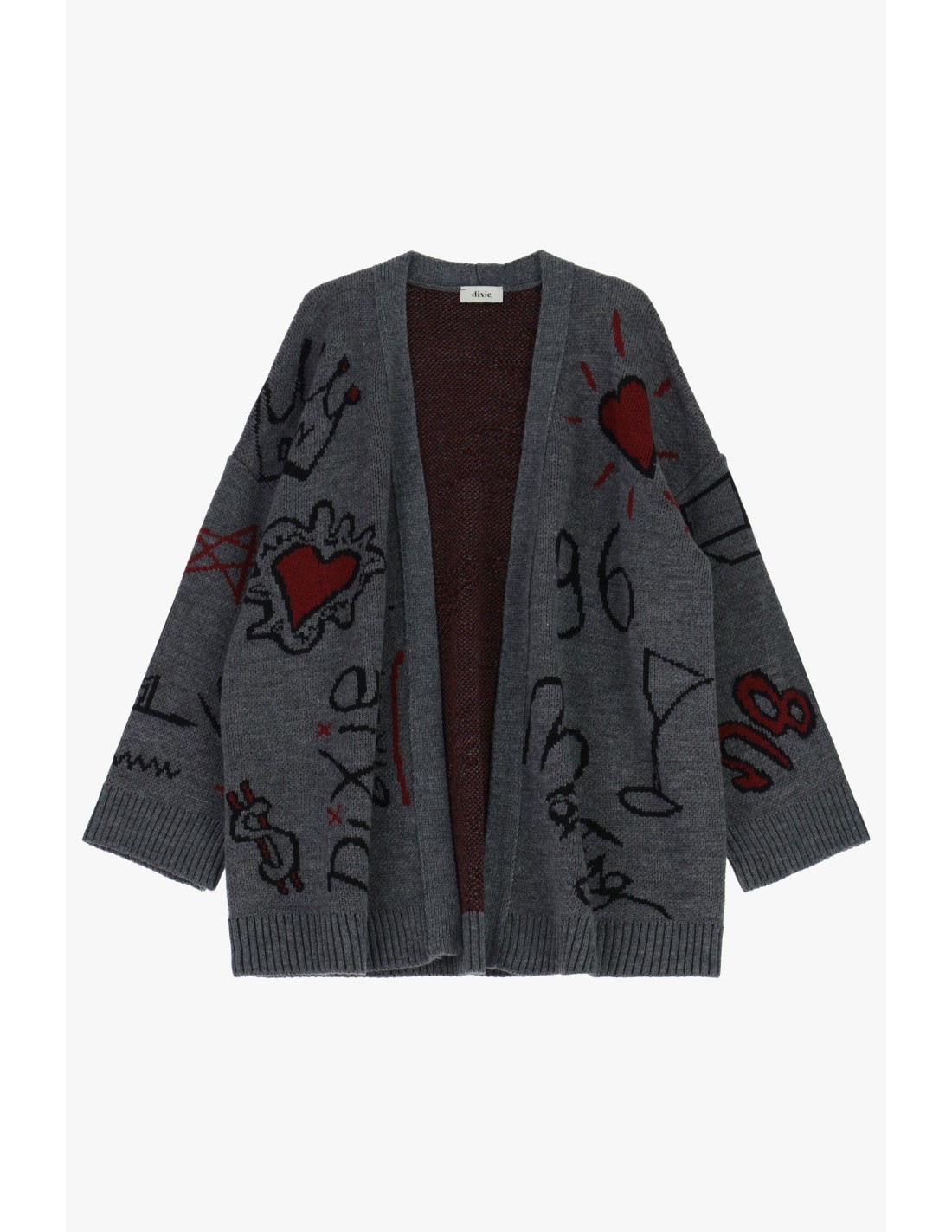 Cardigã de corte largo com mangas compridas e bainhas caneladas, embelezado com motivos gráficos em todo o lado que dão um toque criativo ao seu look diário. Perfeito para usar por cima de tops e camisas para dar personalidade e conforto a qualquer hora do dia.