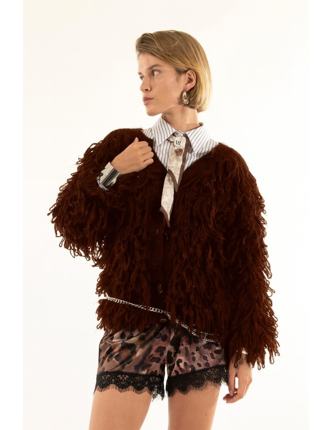 Kontatto assina um casaco macio e envolvente, com corte descontraído. Malha com efeito pelúcia em fio suave com trabalho de franjas, fecho com botões e decote em V que alonga a silhueta. Perfeito sobre denim e botas para o day-to-night, ou sobre vestidos slip para uma festa com um toque glam.