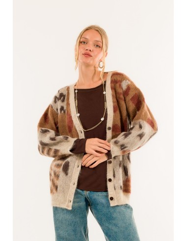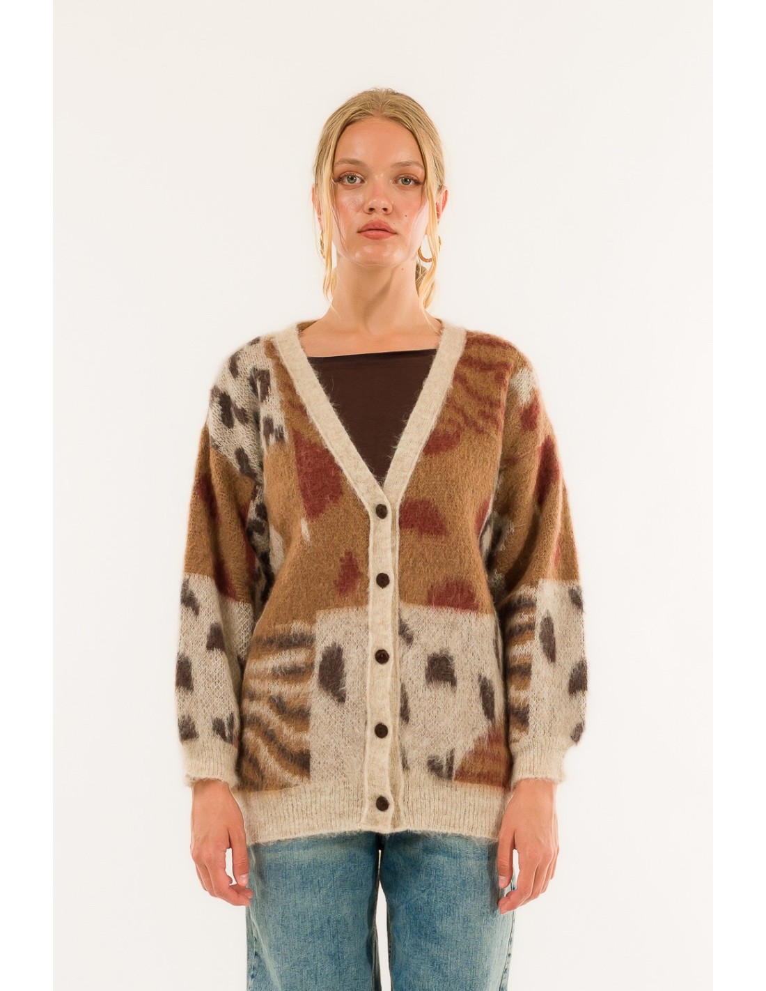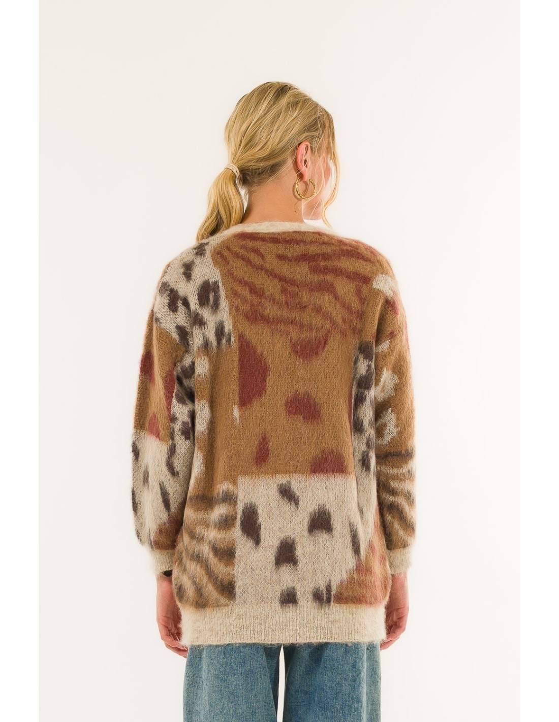 Camisola aberta com um ajuste suave e confortável, em fio macio com uma mão felpuda e trabalho em jacquard com padrão animal. O decote em V e os botões à frente conferem verticalidade à silhueta. Perfeito para o chique do dia a dia: da ganga ao casual de escritório, confere conforto e carácter a todos os looks. Contemporâneo assinado Kontatto.