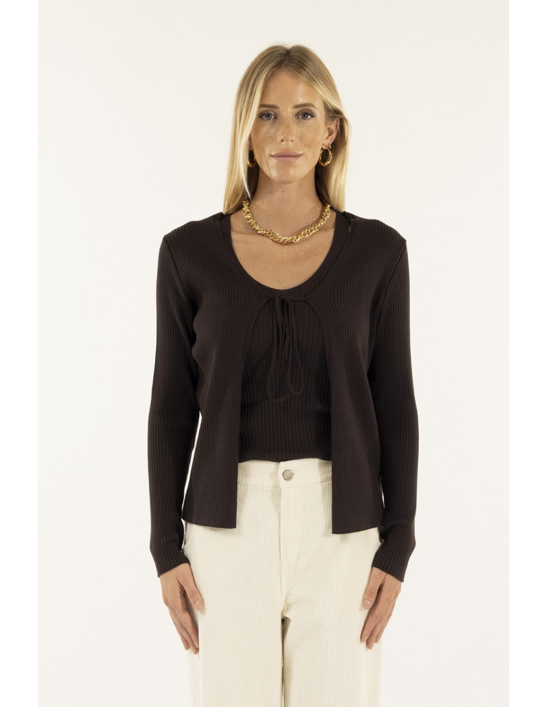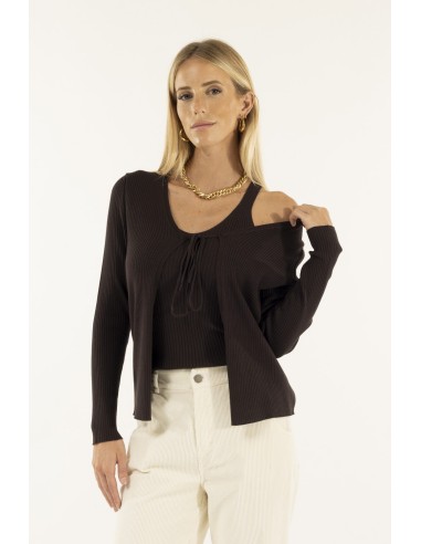 Kontatto propõe uma peça de vestuário de malha justa, mas confortável, numa malha canelada suave e confortável. A abertura frontal com cordões e o decote redondo realçam a silhueta. Perfeito sobre ganga ou alfaiataria para o escritório, é também ideal para o look diário e aperitivos.