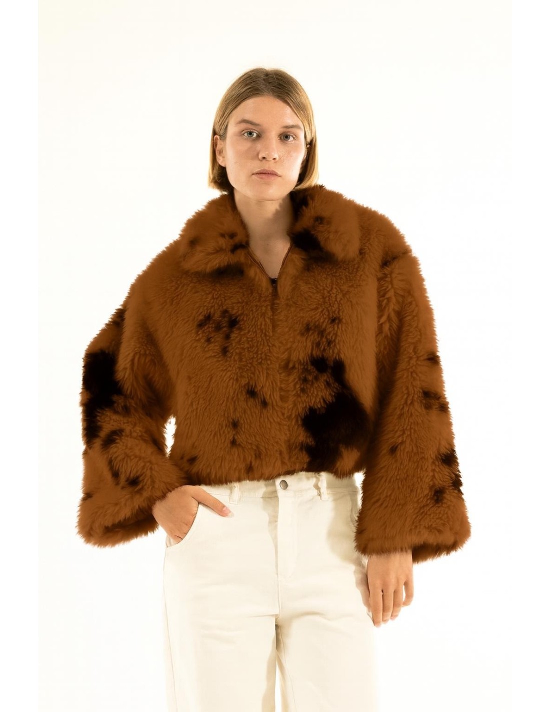 Kontatto assina um casaco curto e macio, com um corte descontraído que realça a cintura. Pelo sintético com efeito shearling, quente e macio ao toque. Gola estruturada e fecho de zip escondido para uma linha limpa. Perfeito para o dia na cidade e para um aperitivo, confere carácter ao denim e a vestidos.