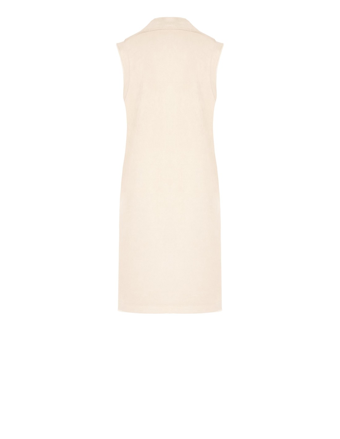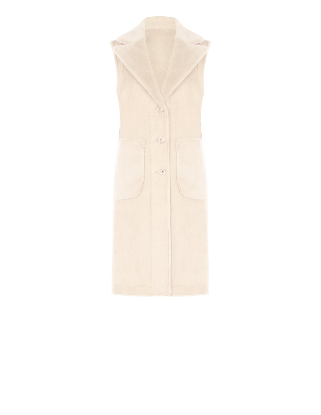 Gilet longo de corte direito e feminino. Reversível: exterior em camurça lisa, interior em pelo sintético macio para calor e conforto. Gola com lapela e fecho de botões, bolsos aplicados para praticidade. Versátil sobre malhas e vestidos, perfeito do escritório ao aperitivo. Rinascimento.