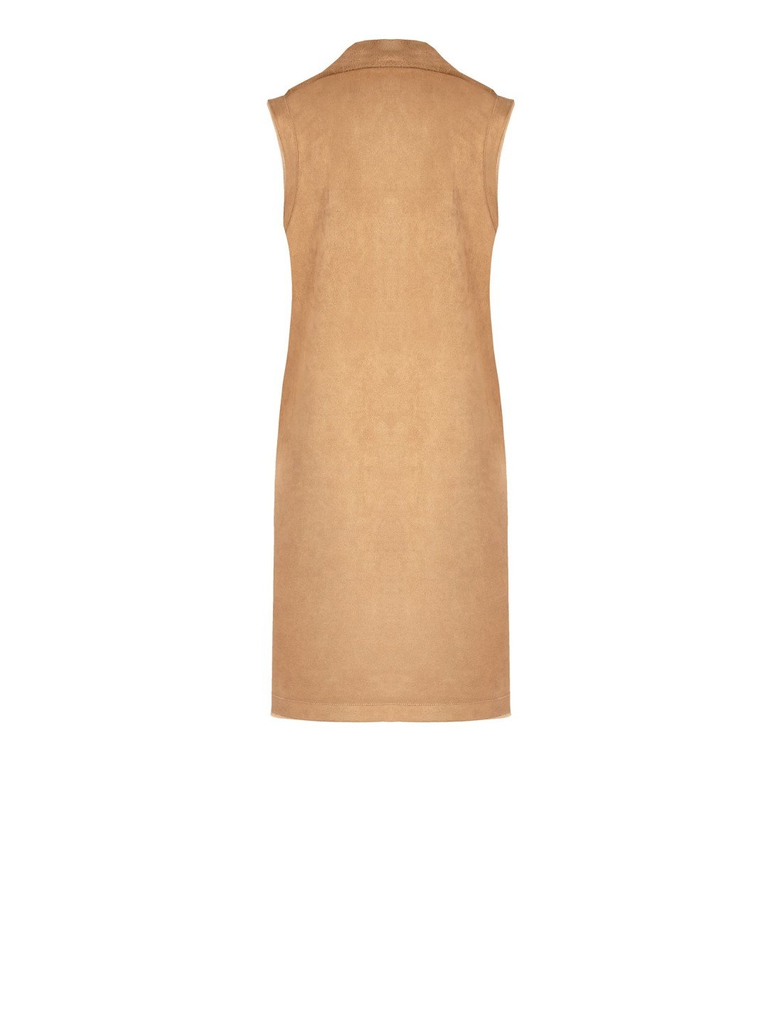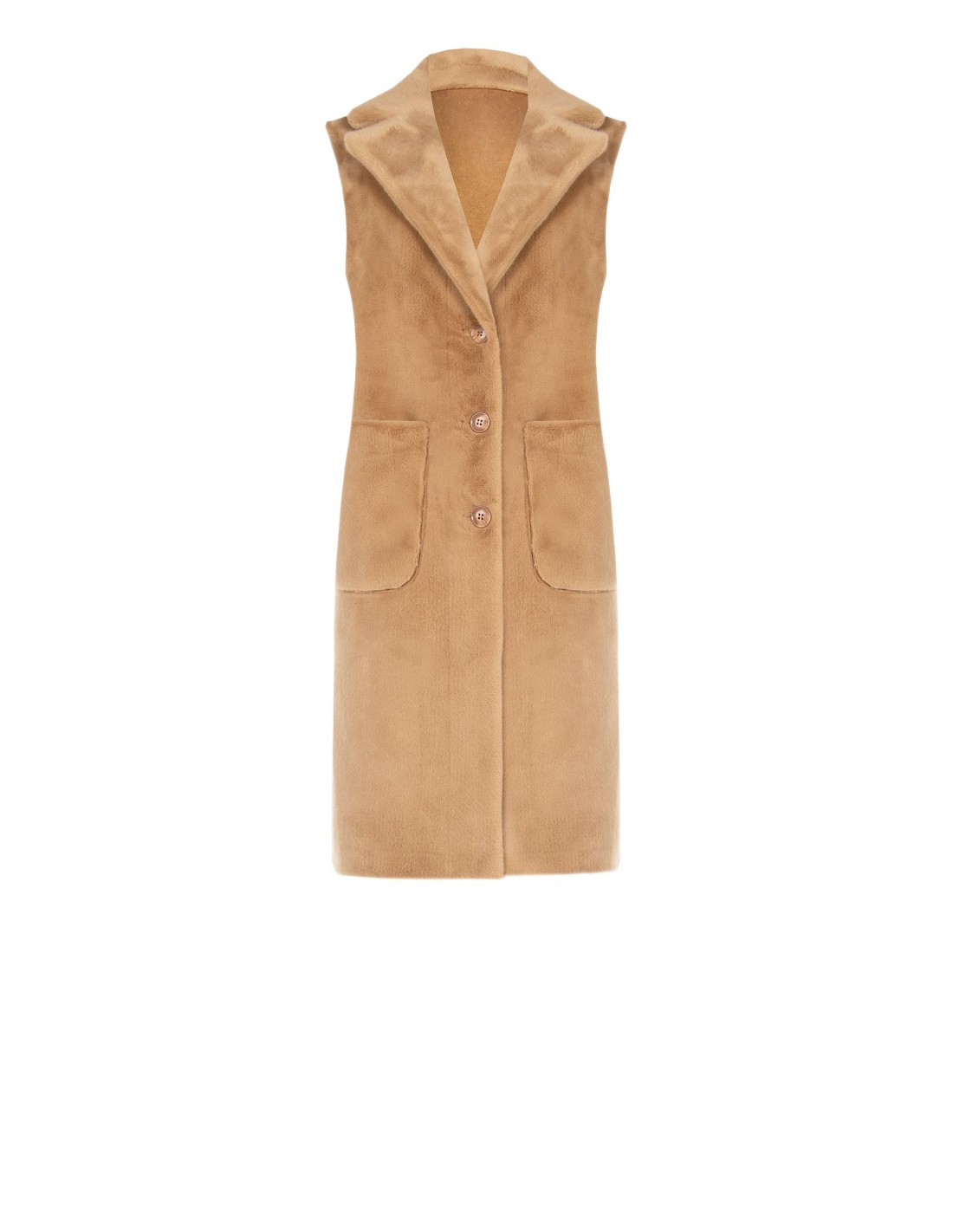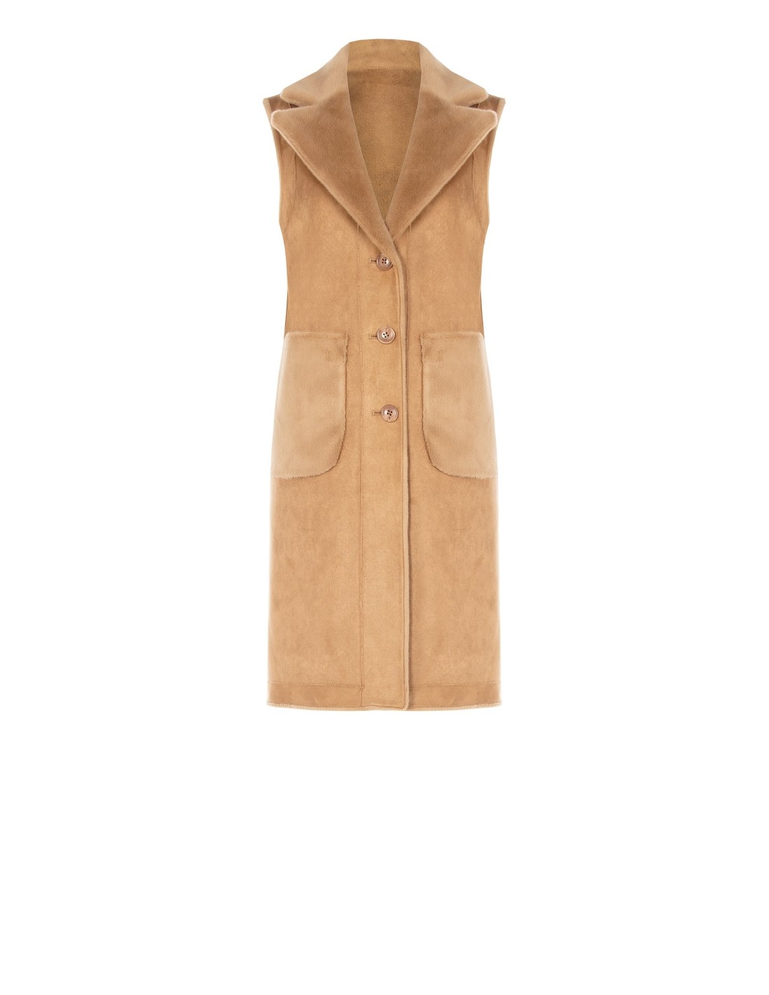 Gilet longo de corte direito e feminino. Reversível: exterior em camurça lisa, interior em pelo sintético macio para calor e conforto. Gola com lapela e fecho de botões, bolsos aplicados para praticidade. Versátil sobre malhas e vestidos, perfeito do escritório ao aperitivo. Rinascimento.