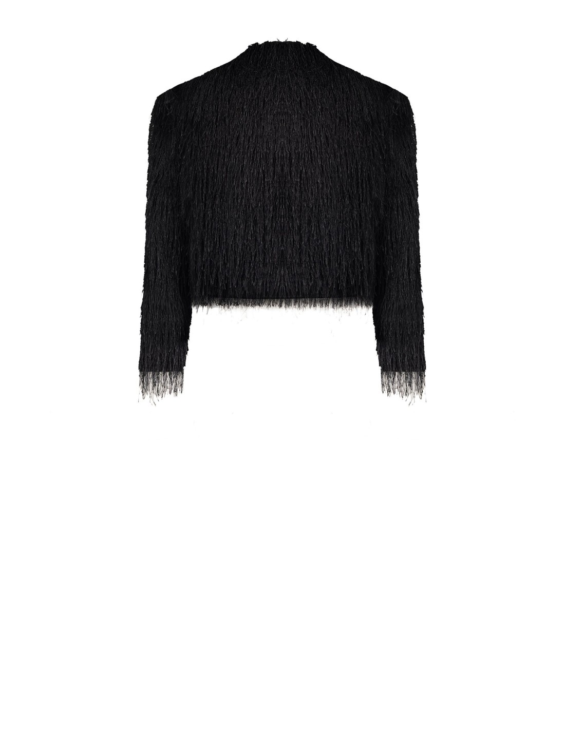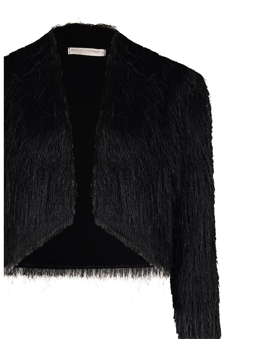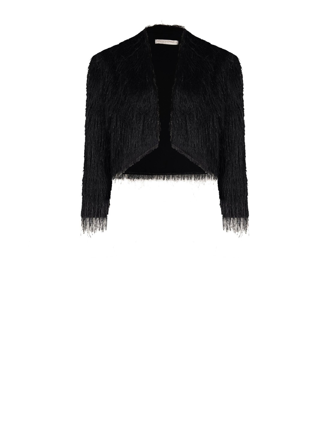 Bolero de corte curto e ajuste suave, pensado para acompanhar a silhueta com leveza. A textura fil coupé com efeito de franjas e a abertura frontal sem fechos acrescentam movimento e carácter. Perfeito sobre vestidos e tops para festas, cerimónias ou noites especiais.